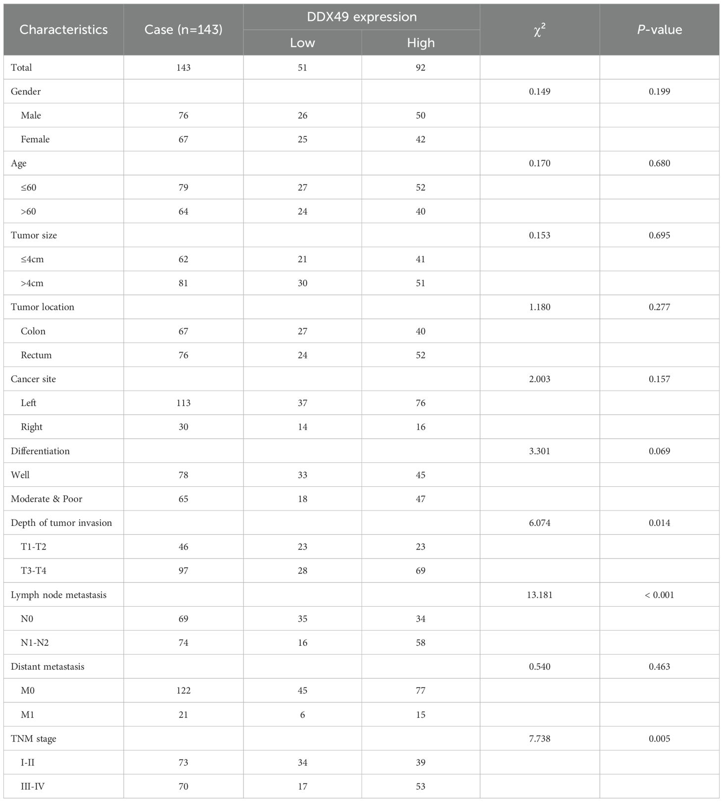 Table 2. Statistical analysis results of the correlation between DDX49 expression and clinicopathological characteristics in CRC patients.