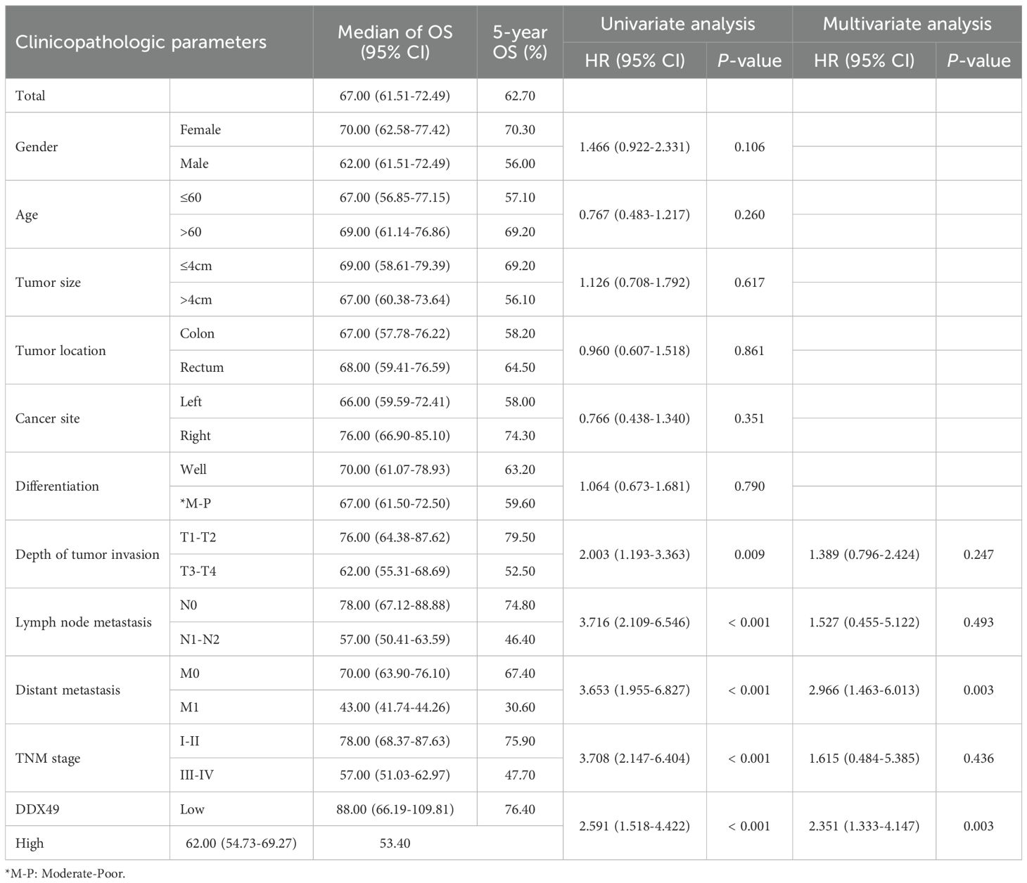 The correlation between gene expression and disease prognosis constitutes a pivotal focus in contemporary medical research. The level of gene expression not only reflects the physiological status of cells but also provides critical insights into disease progression and therapeutic efficacy. In this study, a prognostic analysis of DDX49 expression was performed to investigate its potential value in assessing the survival outcomes of CRC patients. First, the Kaplan-Meier method was employed, and the results indicated that the median overall survival (OS) duration after surgery was 67.00 months, with a 95% CI of 61.51-72.49 (Figure 3A). Subsequently, univariate Cox regression analysis showed that T stage (T3-T4 vs. T1-T2) was statistically associated with OS in with CRC patients (HR: 2.003, 95% CI: 1.193-3.363; P = 0.009; Figure 3H). Similarly, N stage, M stage, and TNM stage were all associated with OS (all P < 0.05; Figures 3I–K; Table 3). Importantly, we found that the high DDX49 expression was associated with poor prognosis (high vs. low, HR: 2.591, 95% CI: 1.333-4.147; P < 0.001; Figure 3L; Table 3). Other variables showed no statistically significant differences (all P > 0.05; Figures 3B–G; Table 3). Furthermore, multivariate Cox regression analysis showed that DDX49 expression (high vs. low) was an independent prognostic factor (HR = 2.351, 95% CI: 1.333-4.147; P = 0.003; Table 3), indicating that DDX49 expression had a statistically significant independent association with survival outcomes in CRC patients.