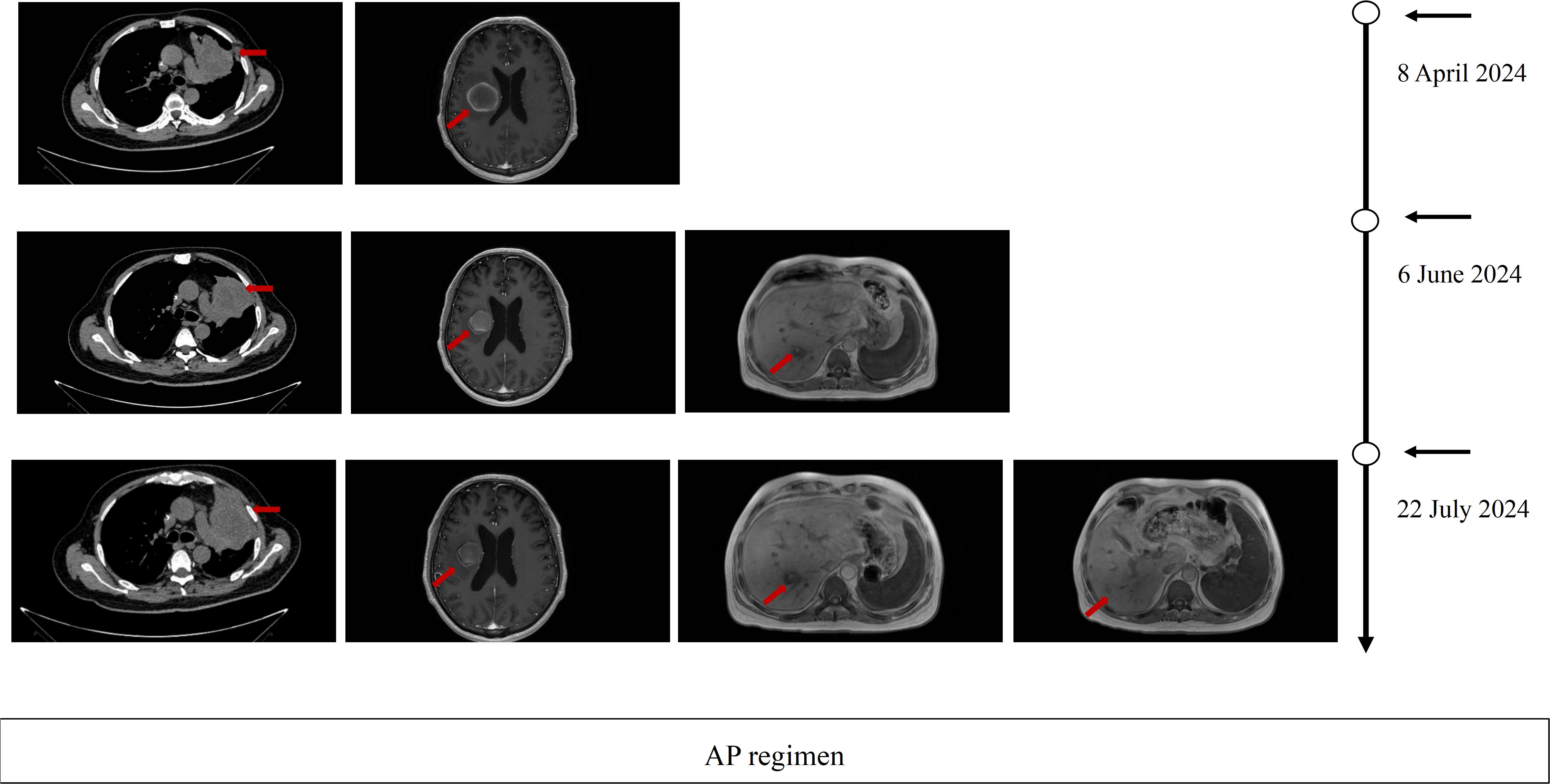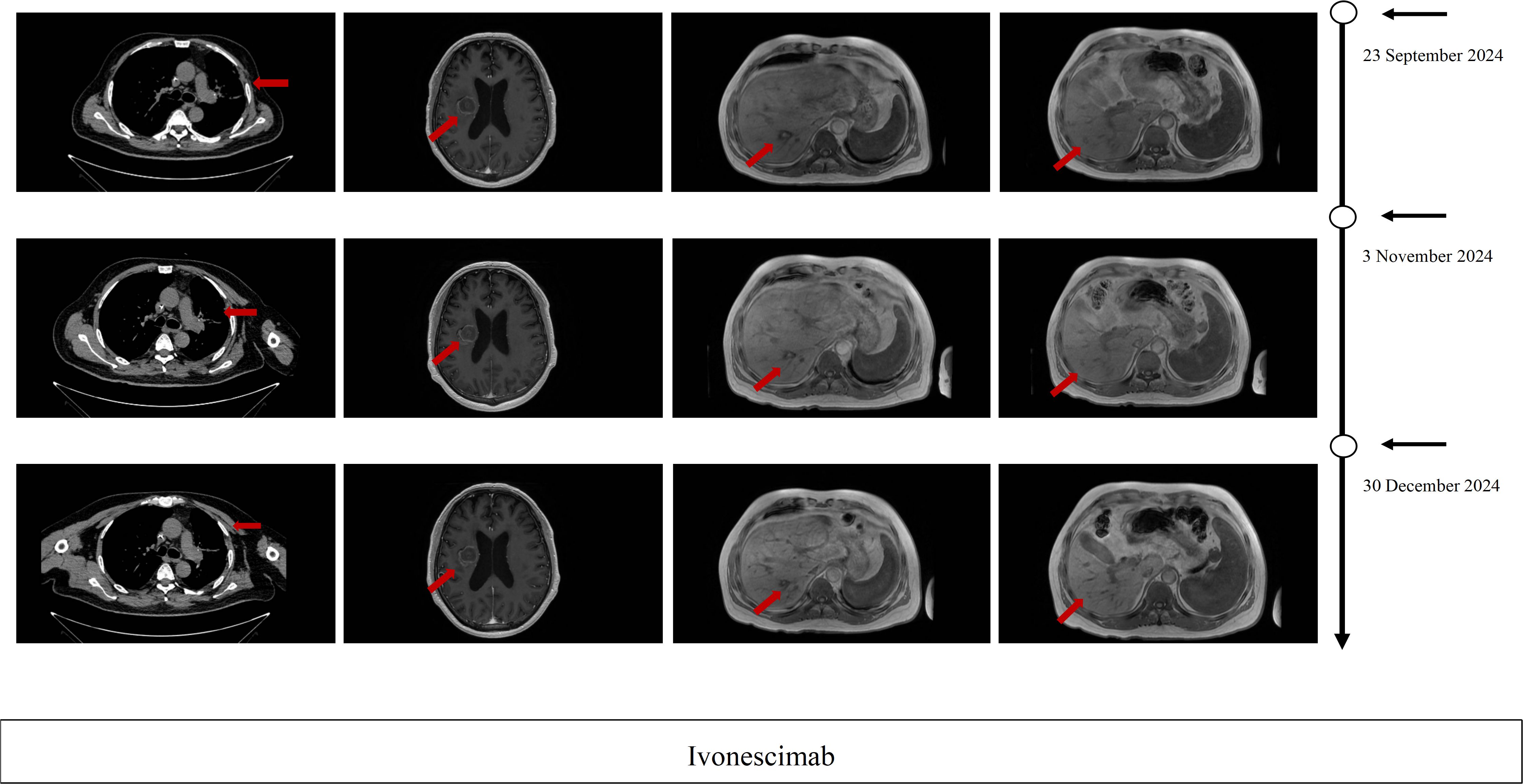 Figure 2. Imaging evaluation during ivonescimab. Therapy Serial thoracic CT, brain MRI, and hepatic MRI after 2 cycles, after 4 cycles and after 6cycles of ivonescimab therapy PR per RECIST 1.1 criteria.