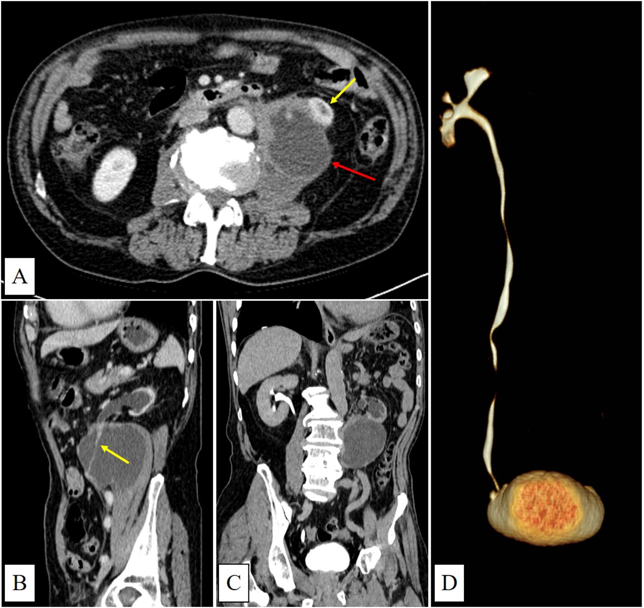 Figure 1. (A) (venous phase) shows a predominantly cystic mass with irregular margins and mild enhancement located in the left psoas major region (red arrow). The lower pole of the left kidney is invaded (yellow arrow). (B) (sagittal view, venous phase) shows the left ureter running through the mass with mild enhancement(yellow arrow). (C) (delayed phase) demonstrates left renal atrophy, dilatation of the left renal pelvis and calyces, and absence of contrast filling within the mass. (D) (CTU) shows no contrast enhancement in the left renal pelvis, calyces, or ureter.