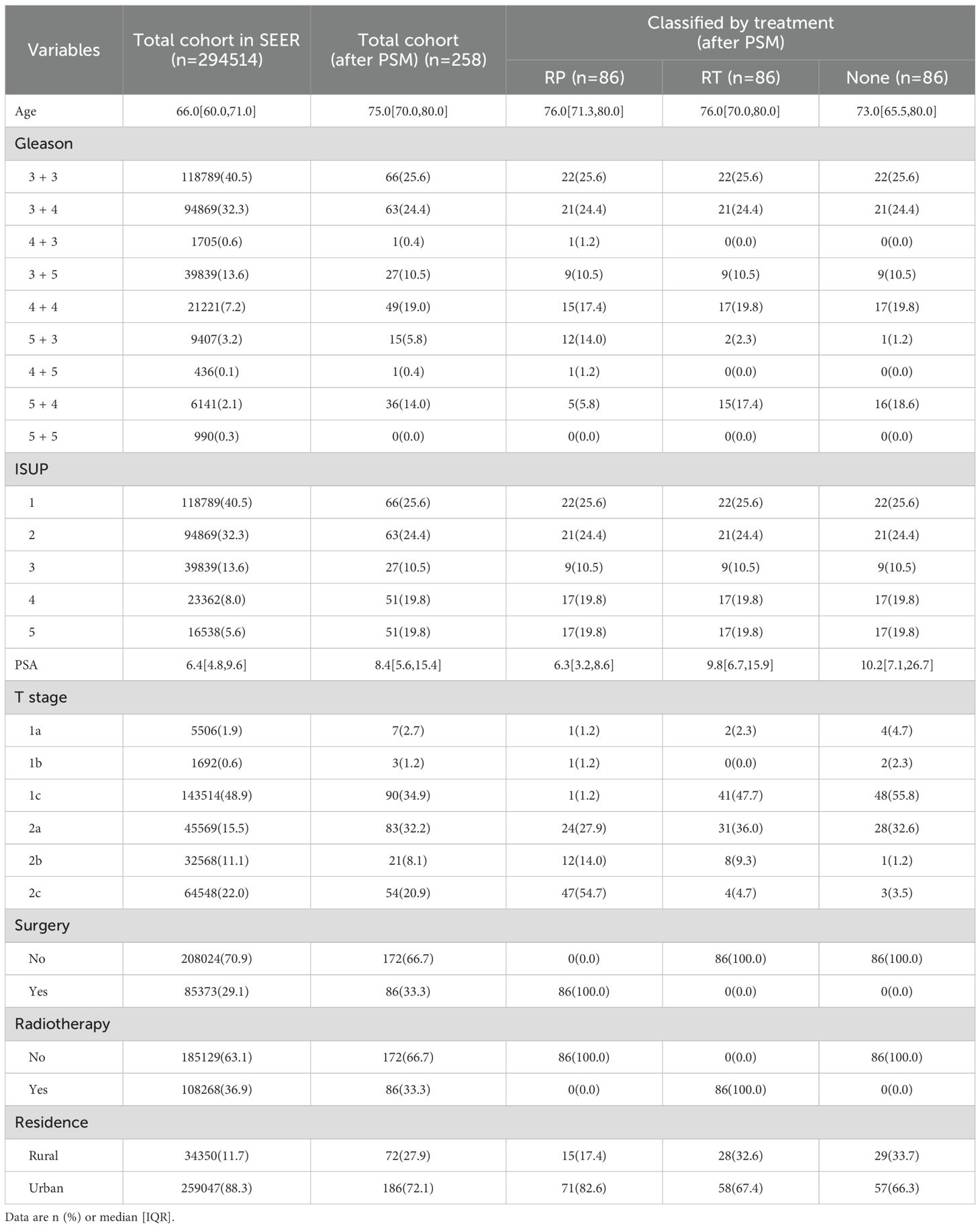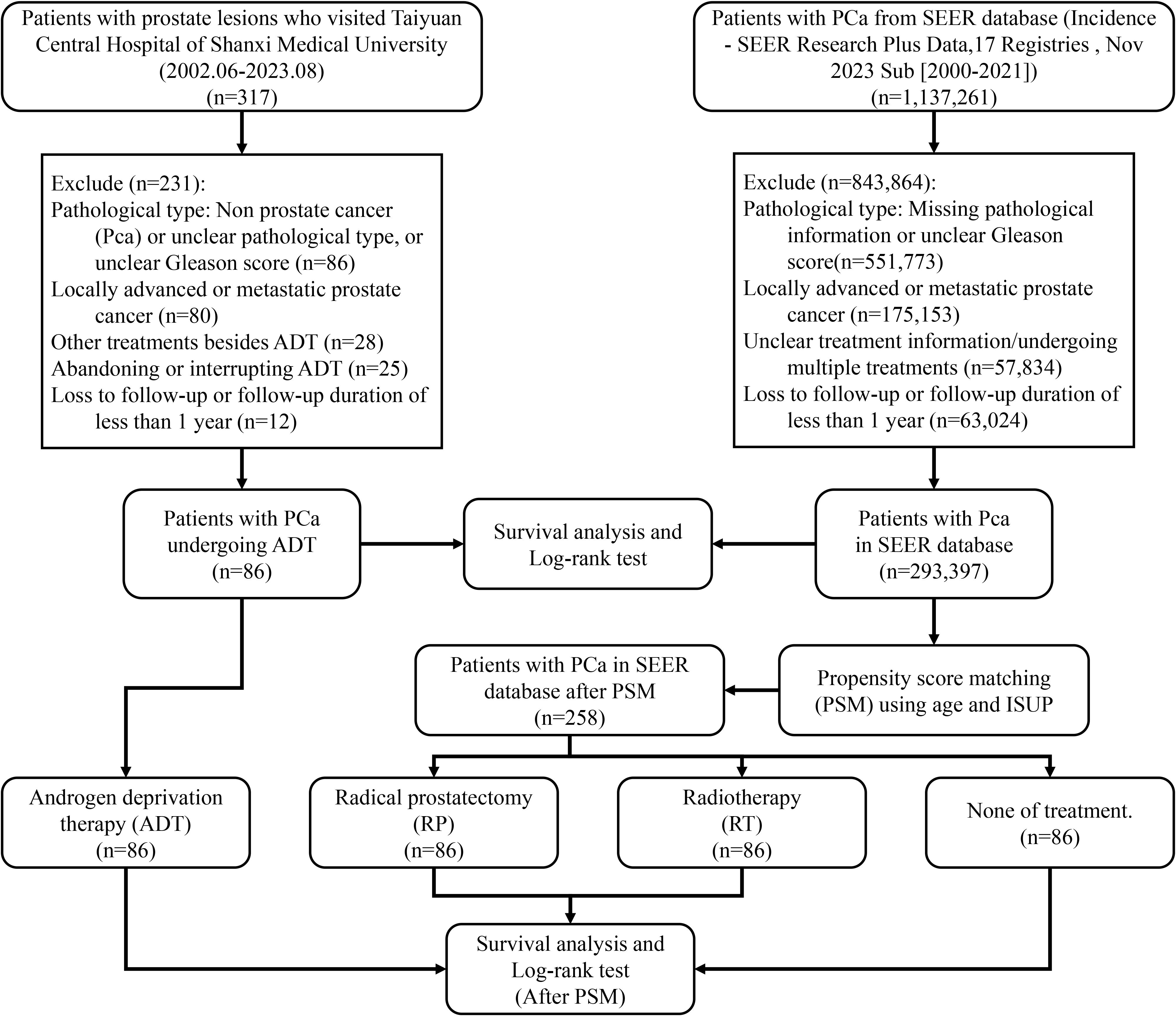 6. loss to follow-up or follow-up duration of less than one year. Data from the SEER database for patients with primary localized PCa (ICD-O: 8140/3, PRIMARY SITE = C61.9) who received other treatments or no treatment were used as control cohorts. To ensure temporal consistency across cohorts, we specified the study periods for each group. The ADT cohort from our institution included patients diagnosed between 2002 and 2023, whereas the SEER database initially comprised more than one million cases from 2000 to 2021. After applying inclusion and exclusion criteria, the final analytical cohort contained 293,397 patients diagnosed between 2010 and 2021. Propensity score matching further yielded 258 patients (86 in each of the RP, RT, and non-treatment groups) within the same 2010–2021 timeframe. This period corresponds to the era following the widespread adoption of robotic-assisted radical prostatectomy, ensuring that surgical outcomes reflect modern operative techniques.