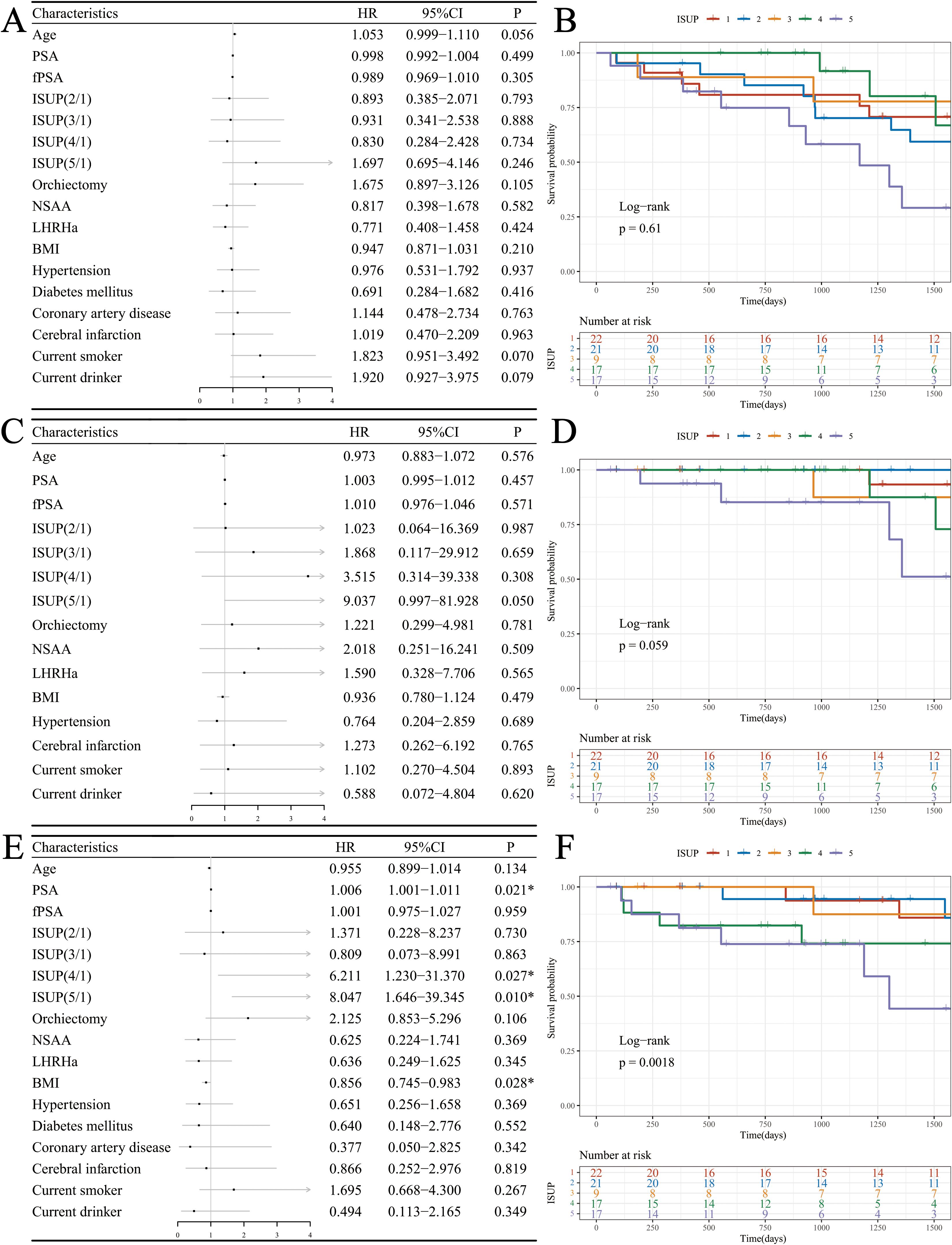 Figure 2. Survival analysis in the ADT cohort. (A) Forest plot of OS; (B) KM curves of OS based on ISUP grade; (C) Forest plot of DSS; (D) KM curves of DSS based on ISUP grade; (E) Forest plot of PFS; (F) KM curves of PFS based on ISUP grade.
