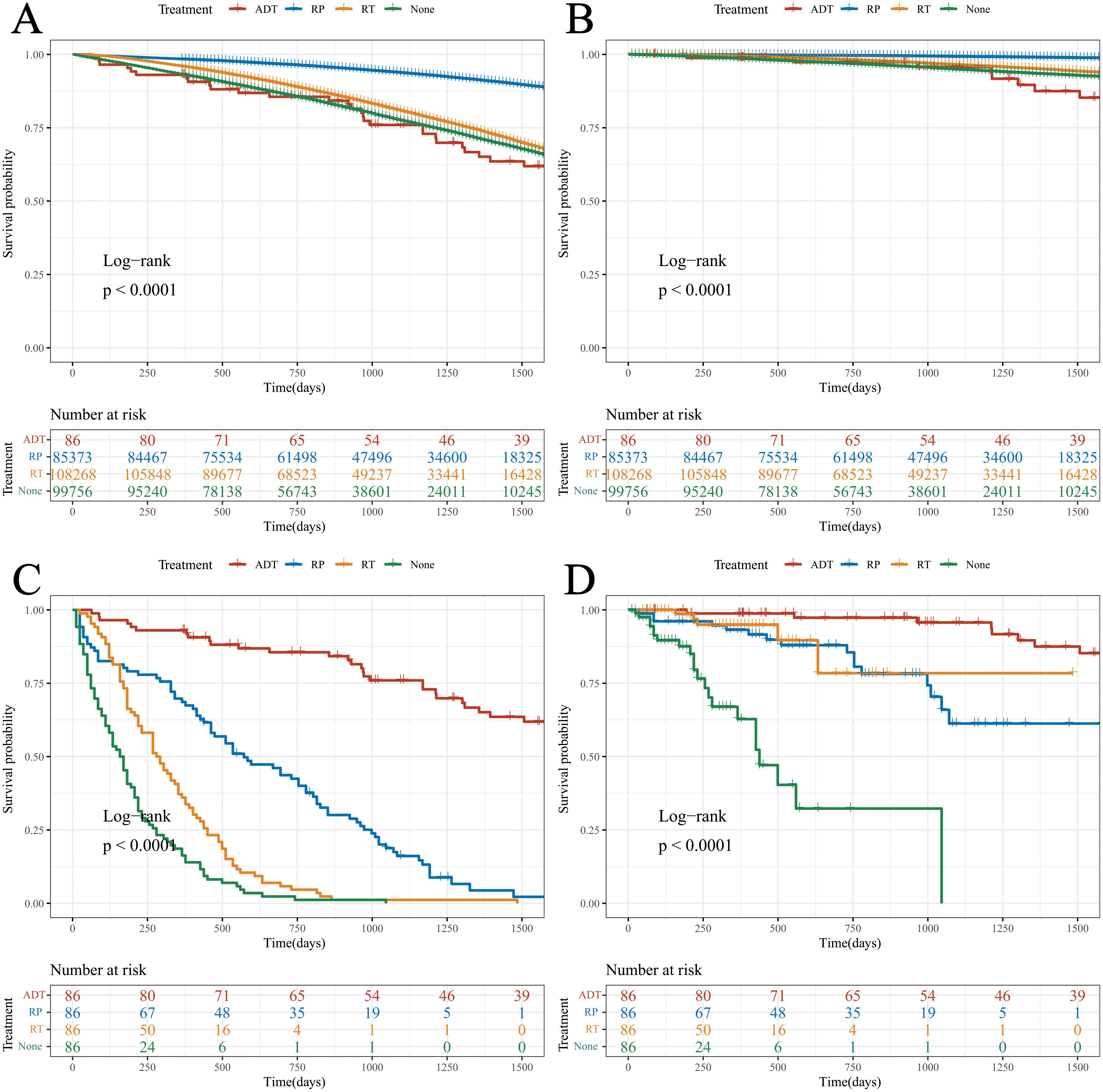Following PSM, Log-rank tests indicated that both OS and DSS in the ADT cohort were superior to those in the other three groups. This suggests that, under comparable age and pathological stage conditions, the therapeutic efficacy of ADT appears to be greater than that of RP and RT (Figures 3C, D).