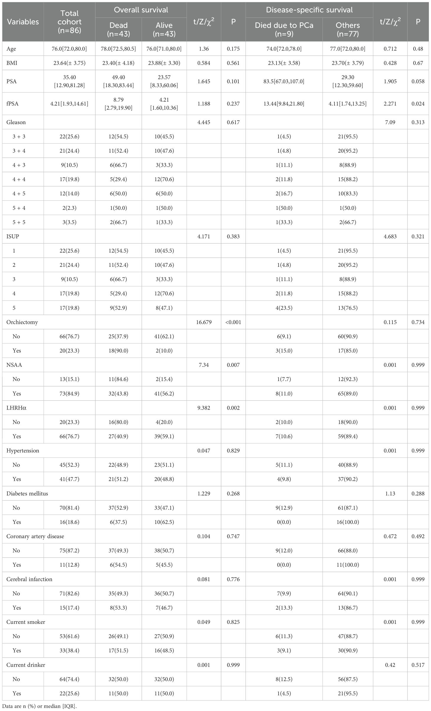 A total of 86 patients who underwent ADT were included in this study, all of whom completed the full follow-up. The median follow-up duration was 2,152.5 days [1,176.75, 3,540.25], with the longest follow-up duration lasting 5,045 days. The baseline characteristics of the patients are summarized in Table 1. At the time of initial diagnosis, the median age was 76.00 years. The distribution of ISUP grades was as follows: Grade 1 in 22 patients (25.6%), Grade 2 in 21 patients (24.4%), Grade 3 in 9 patients (10.5%), Grade 4 in 17 patients (19.8%), and Grade 5 in 17 patients (19.8%). All patients received one or more forms of ADT, with 73 patients (84.9%) receiving NSAA therapy (including Bicalutamide, Apalutamide, Enzalutamide and Darolutamide), and 66 patients (76.7%) opted for LHRHa therapy (including Leuprorelin and Goserelin). In addition, 20 patients (23.3%) underwent bilateral orchiectomy.