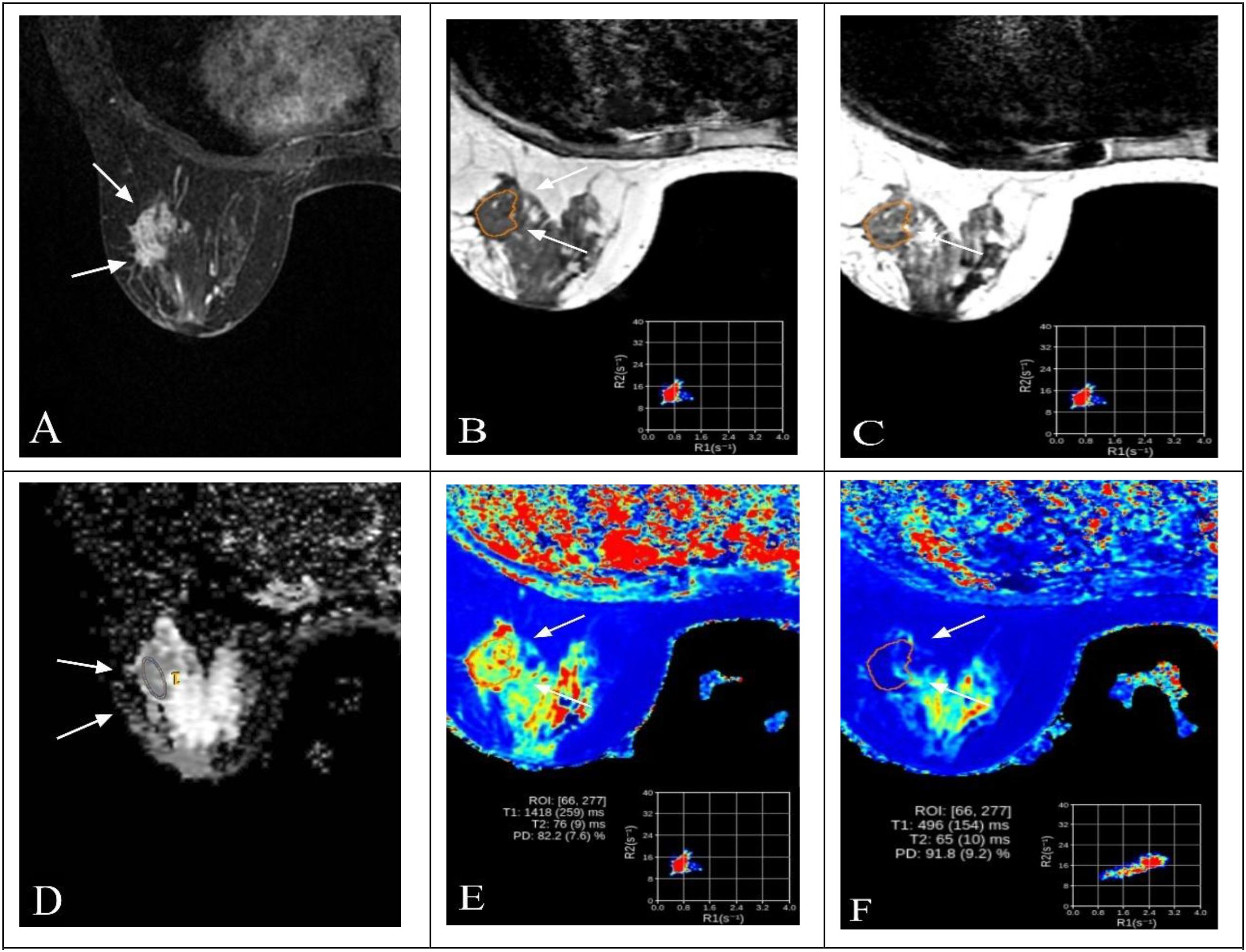 Figure 3. Representative multiparametric MRI findings in a 63-year-old woman with invasive breast cancer and HER2 overexpression (IHC 3+). (A) DCE-MRI showing a heterogeneously enhancing lesion in the right breast (arrows). (B, C) SyMRI parametric maps (T1-pre and T2-pre) with ROI placement. (D) ADC map from MUSE-DWI demonstrating restricted diffusion (arrows). (E) Pre-contrast SyMRI T1 mapping (T1-pre) with quantitative measurement. (F) Post-contrast SyMRI T1 mapping (T1-Gd) showing shortened relaxation time within the lesion.