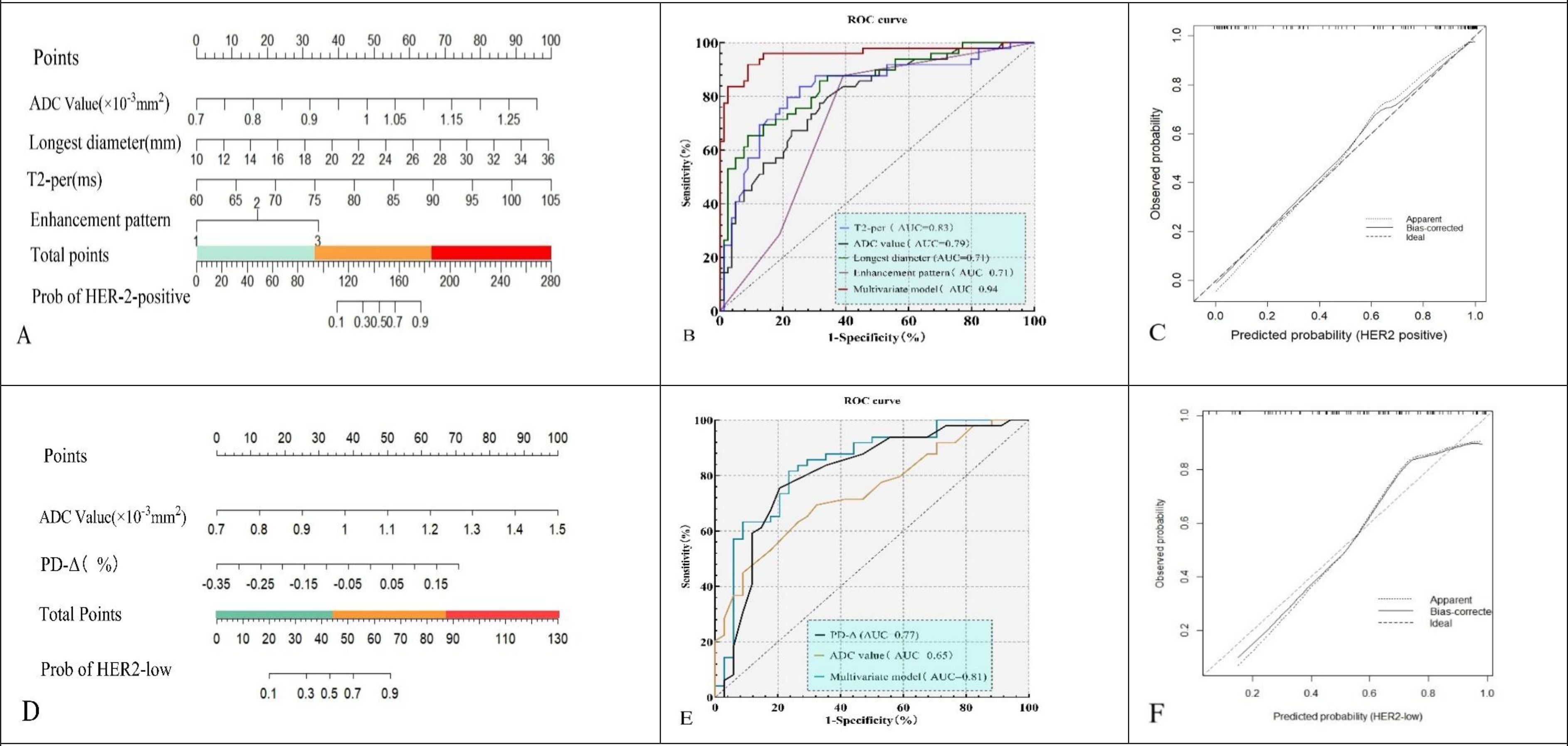 Figure 4. Nomograms (A, D), ROC curves (B, E), and calibration plots (C, F) for the HER2-positive model (A–C) and HER2-low vs HER2-zero model (D–F).The models yielded AUCs of 0.94 (95% CI: 0.90–0.98) and 0.81 (95% CI: 0.73–0.89), respectively, with good calibration.