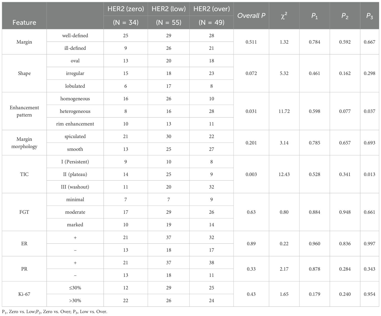 Comparisons of imaging features revealed significant differences in enhancement pattern (P = 0.020) and TIC type (P = 0.014). Heterogeneous enhancement was more frequent n the HER2-overexpressing (HER2-oe) group than in the HER2-low group (P = 0.037) and tended to be higher than in the HER2-zero group (P = 0.077). The washout TIC type was more common in the HER2-oe group compared with the HER2-low group (P = 0.013), whereas the plateau type was less frequent. Other morphological features, including lesion boundary (P = 0.513), shape (P = 0.225), margin (P = 0.208), and background parenchymal enhancement (P = 0.638), showed no significant differences among groups (Table 2).