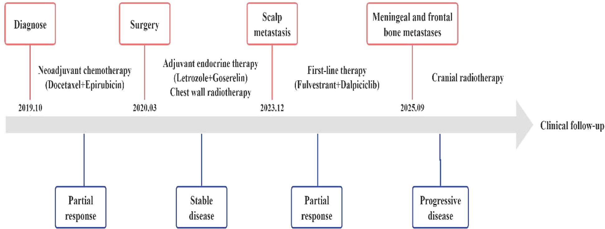 Case presentation: We report the case of a 45-year-old woman diagnosed with invasive ductal carcinoma (IDC) of the right breast with ipsilateral axillary lymph node involvement (clinical stage cT4bN3M0). The patient received six cycles of neoadjuvant chemotherapy and achieved a partial response (PR) according to RECIST 1.1 criteria. Subsequently, she underwent a right simple mastectomy with axillary lymph node dissection. Pathology demonstrated a Miller–Payne grade 3 response, with metastases identified in all 13 dissected axillary lymph nodes (13/13). Immunohistochemistry (IHC) revealed estrogen receptors (ER) and progesterone receptors (PR) positivity, human epidermal growth factor receptor-2 (HER2) expression of 0, and Ki-67 expression of 20%. She subsequently received adjuvant radiotherapy and endocrine therapy. Surveillance imaging during follow-up showed no evidence of recurrence or distant metastasis. In December 2023, the patient developed a painless, round, skin-colored nodule on the left frontal scalp, accompanied by diffuse right periorbital edema and headache. Over the following year, she was evaluated in dermatology, neurosurgery, and oncology clinics. However, breast cancer metastasis was not initially suspected, resulting in misdiagnosis and delayed treatment. In April 2025, fine-needle aspiration of the scalp nodule confirmed metastatic carcinoma. IHC showed ER and PR positivity, HER2 expression of 1+, and Ki-67 expression of 35%. No additional metastatic lesions were identified. The patient was started on systemic therapy with fulvestrant plus dalpiciclib, and after four cycles, she achieved marked regression of the scalp lesion along with resolution of periorbital edema. The most recent examination, however, detected meningeal and calvarial metastases. Consequently, the patient received localized radiotherapy to these sites while continuing the original treatment protocol.