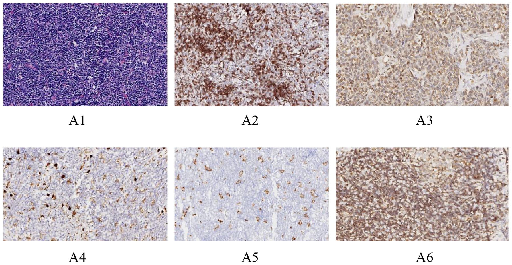 Figure 1. Immunohistochemical images of different antibodies. (A1: HE staining results (20X). A2: Positive results of CD8 staining (20X). A3: Positive CD20 staining results (20X). A4: Positive CD204 staining results (20X).A5: Positive CD206 staining results (20X).A6: Positive CD47 staining results (20X).).