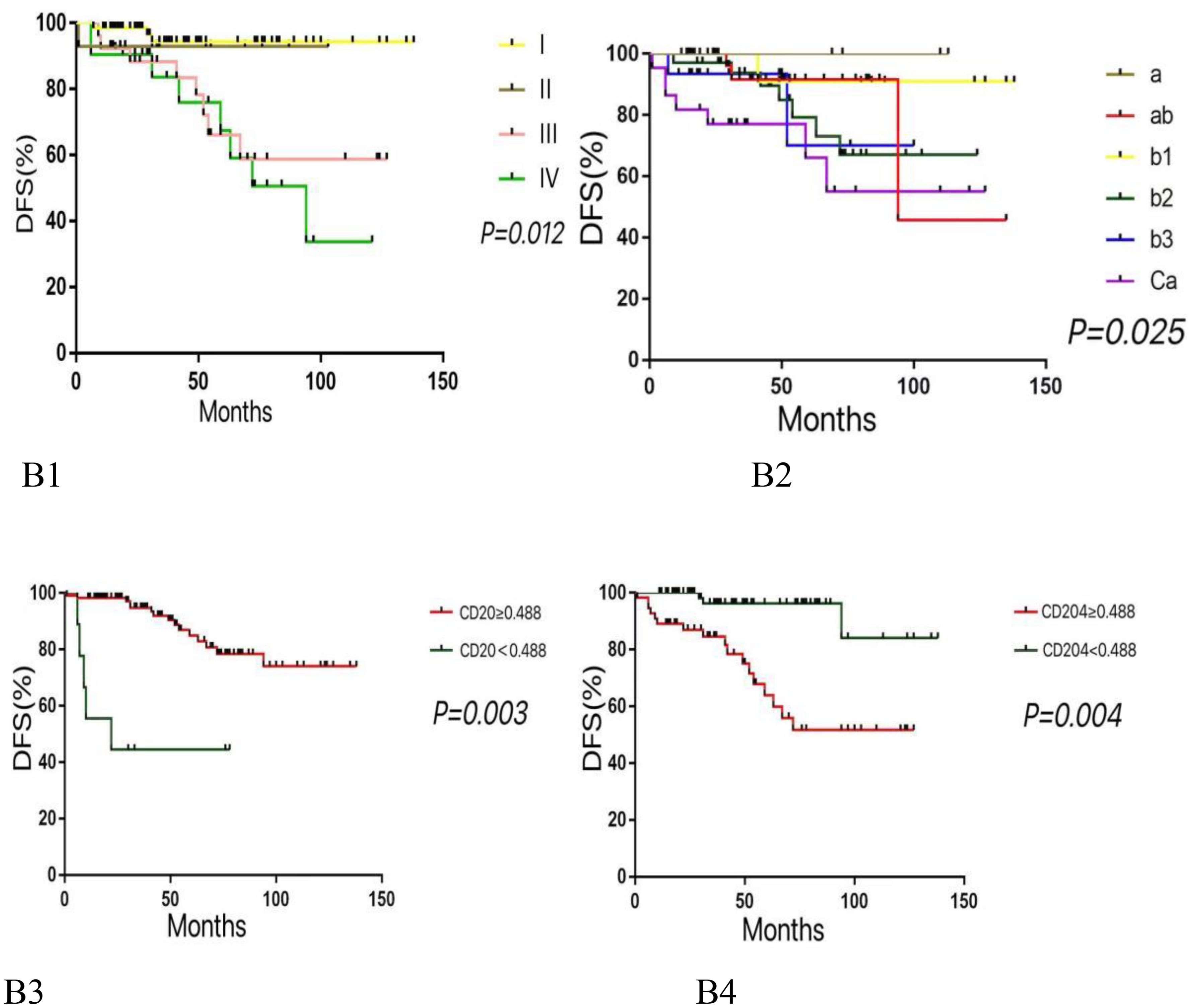 Figure 2. Kaplan-meier survival curves for DFS according to various variables. (B1: Higher histological subtypes are associated with lower DFS. B2: Advanced tumor stages correlate with reduced DFS. B3: Lower expression levels of CD20 are linked to decreased DFS. B4: Higher expression levels of CD204 are associated with lower DFS.).