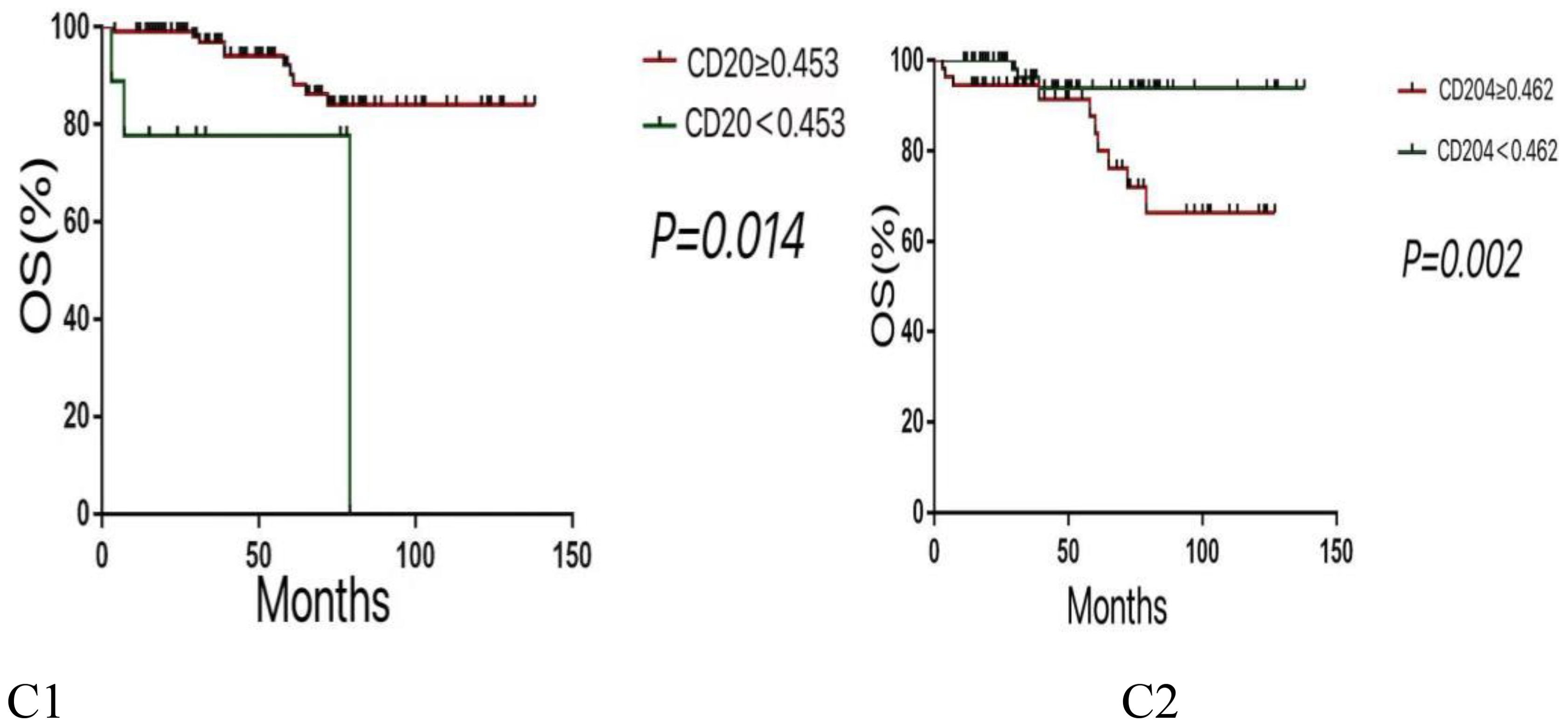 Figure 3. Kaplan-Meier survival curves for OS according to various variables. (C1:Lower expression levels of CD20 are associated with poorer OS. C2:Higher expression levels of CD204 are linked to reduced OS.).