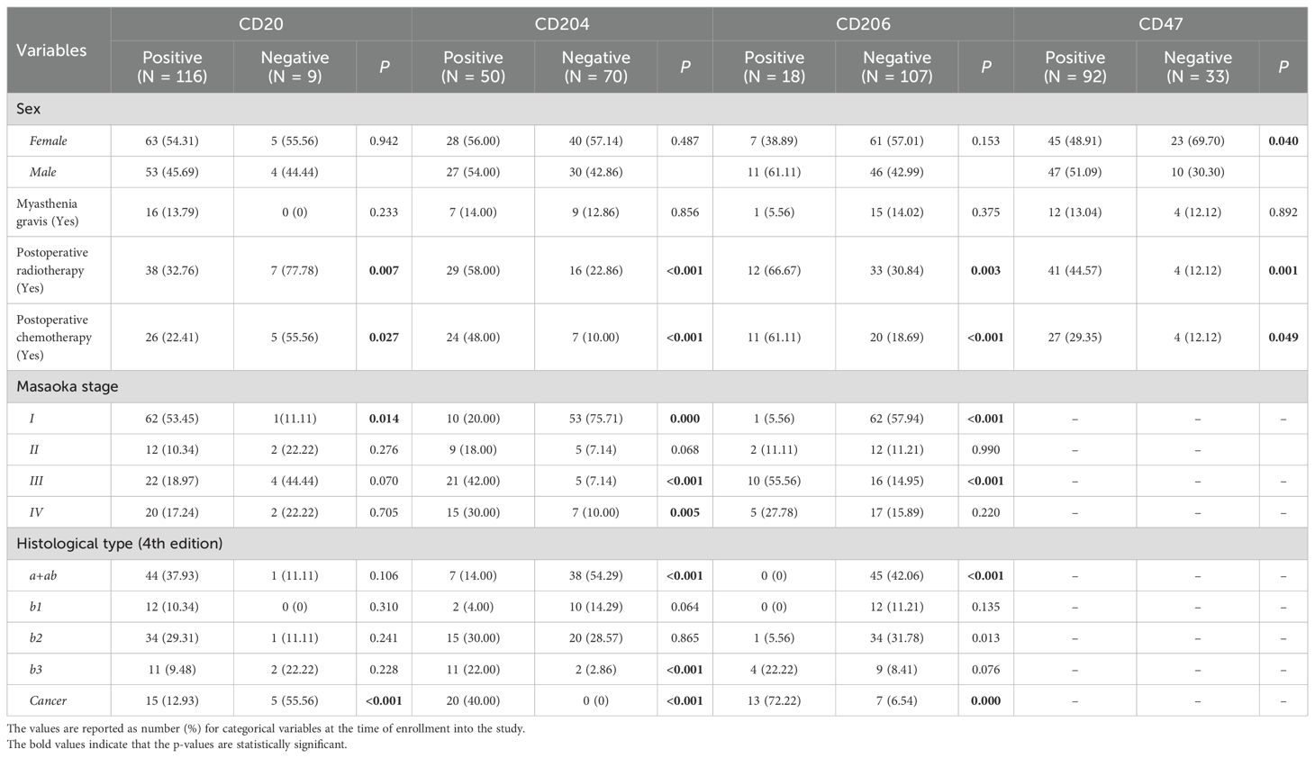 This study presents an opportunity to uncover more potent cancer treatment strategies, aiming to provide a reference for understanding the characteristics of Thymic Epithelial Tumors (TETs) and assisting in clinical diagnosis and treatment. It is posited that the detection of biomarkers for TETs could serve as a valuable adjunct to Masaoka staging and WHO classification in predicting the efficacy and prognosis of TETs. This study has several limitations. Due to the rarity of TETs, the number of samples collected is relatively small. Additionally, the analysis relies on a single cohort, which limits the robustness of the findings. Including additional independent cohorts or validation datasets is essential to strengthen the conclusions. Furthermore, the markers investigated—CD20 (B cells), CD204 (macrophages), and other T-cell-related indicators—are primarily immune-related. However, it remains unclear whether potential interactions among these immune cell populations contribute to the observed outcomes.