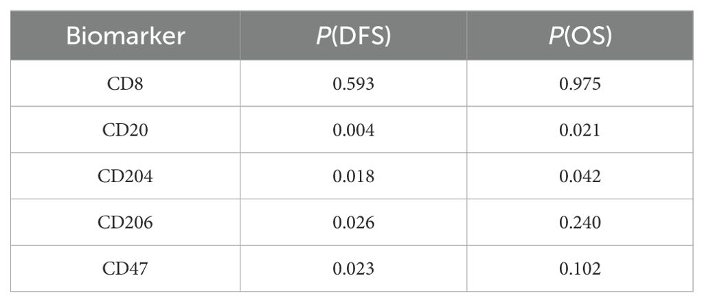 Results: Among the analyzed markers, CD20, CD204, CD206, and CD47 emerged as potential predictors for disease-free survival (DFS), while CD20 and CD204 showed prognostic relevance for overall survival (OS). Specifically, stromal CD20+ TIIC density was independently associated with prolonged DFS(HR=4.74, 95% CI(1.673-13.434), P=0.003) and OS (HR=5.086, 95% CI(1.391-18.594), P=0.014), whereas elevated CD204+ TIIC infiltration correlated with reduced DFS(HR=0.154, 95% CI(0.043-0.547), P=0.004) and OS(HR=0.169, 95% CI(0.056-0.607), P=0.002).