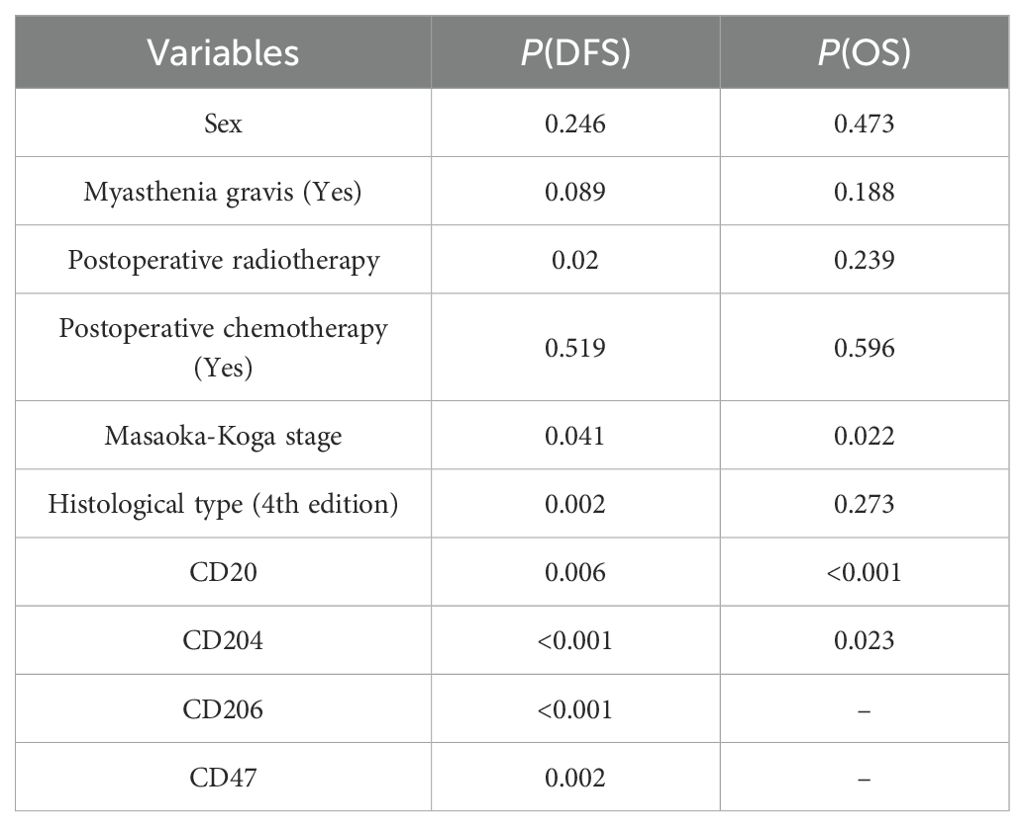 The overexpression of CD206 has been associated with poor prognosis in locally advanced breast cancer (29), and in oral squamous cell carcinoma, it promotes tumor progression by releasing EGF and inhibits antitumor immune responses (30).Additionally, it is significantly correlated with tumor recurrence in mid-to-late stage colorectal cancer (31). Results in this study indicate that the expression of CD206 is significantly negatively correlated with DFS in TETs, but not with OS. A similar situation is observed with CD47, whose overexpression has been found in various tumors and has been proven to be an independent poor prognostic factor in malignant tumors such as lung cancer (32) and gastric cancer (33).However, in our study, neither CD206 nor CD47 was independent prognostic factors for TETs, showing significant correlation only with DFS. Another marker, CD8, has been shown in previous retrospective studies to have significant prognostic implications for thymic carcinoma patients due to the density of CD8+ stromal infiltrating lymphocytes (28). However, our study found no correlation between CD8 expression and DFS or OS in TETs. Results in this study may be related to the clinical characteristics of TETs, necessitating further subgroup analysis. Results from more aggressive thymic carcinomas may be more representative.