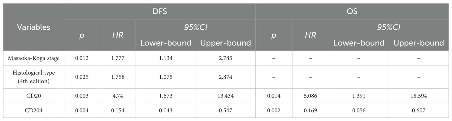 Multivariate analysis using the COX proportional hazards regression model (Table 4) identified stage as an independent prognostic factor for disease-free survival (DFS) in thymic epithelial tumors (TETs), with P = 0.012 and a hazard ratio (HR) of 1.777. Histological type was also an independent prognostic factor for DFS in TETs, with P = 0.025 and an HR of 1.758. The expression of CD20 was found to be an independent prognostic factor for both DFS and overall survival (OS) in TETs, with P values of 0.003 (DFS) and 0.014 (OS), and hazard ratios of 4.74 (DFS) and 5.086 (OS), respectively. Similarly, the expression of CD204 was identified as an independent prognostic factor for DFS and OS in TETs, with P values of 0.004 (DFS) and 0.002 (OS), and hazard ratios of 0.154 (DFS) and 0.169 (OS), respectively. COX regression survival curves are presented in Figures 2, 3.