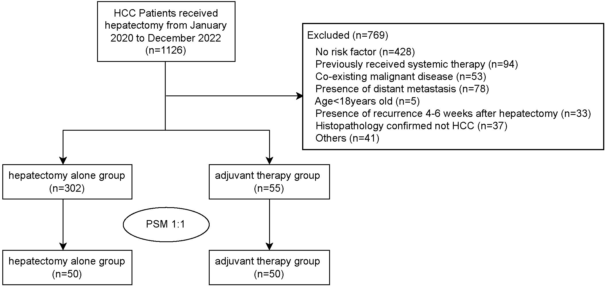 The inclusion criteria were as follows: 1) age ≥ 18 years; 2) histopathology confirmed HCC; 3) HCC patients underwent R0 resection; 4) Child-Pugh A or B; 5) No prior systemic anti-tumor treatment before radical hepatectomy; 6) no residual or recurrent tumor on postoperative radiology at 4–6 weeks after hepatectomy; 7) at least one high risk factor for recurrence: MVI, PVTT, HVTT, satellite nodules, tumor nodules > 3, AFP > 400 ng/ml, or maximum tumor size > 5 cm. The exclusion criteria were as follows: 1) sarcomatoid HCC, HCC mixed with cholangiocarcinoma, or fibrolamellar HCC; 2) history of other malignancies; 3) incomplete follow-up records; (4) non-compliance with adjuvant therapy.