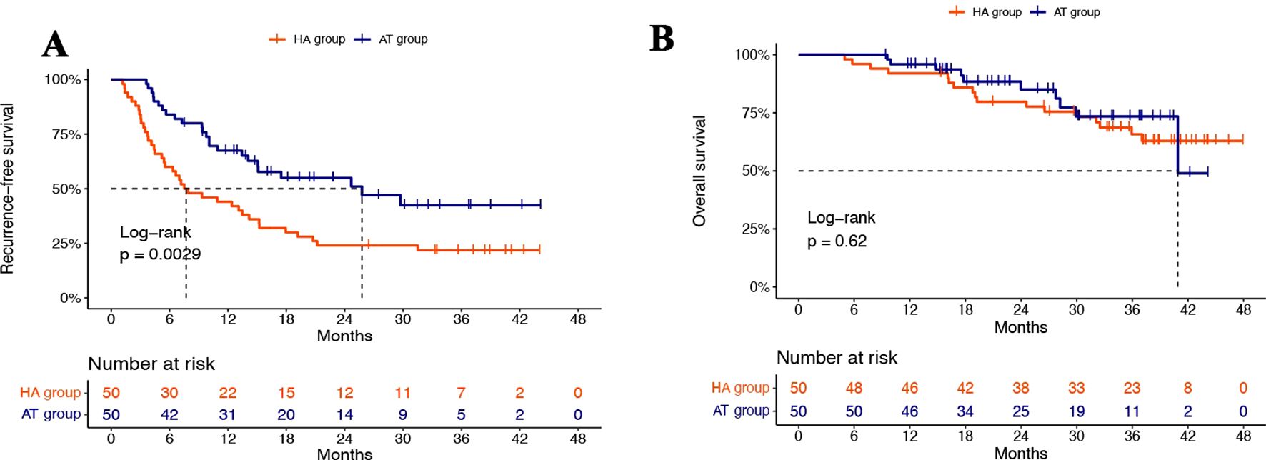 After PSM, the median follow-up was 30.2 months (IQR 18.47–37.48). Among the 100 matched patients, 63 (63%) experienced recurrence and 27 (27%) died. The median RFS was 25.77 months (95% CI: 15.07- not evaluated (NE)) in the AT group versus 7.7 months (95% CI: 5.43-15.2) in the HA group. The corresponding 1-year, 2-year, and 3-year RFS rates were 67.46%, 51.03%, and 42.40% in the AT group, compared to 42.0%, 24.0%, and 21.8% in the HA group, respectively. The RFS of patients in the AT group was significantly longer than that of patients in the HA group (p = 0.0029, Figure 2A). The median OS was 40.9 months (95% CI: 40.9- NE) in the AT group, while the HA group did not reach the median OS. The corresponding 1-year, 2-year, and 3-year OS rates were 95.91%, 85.03%, and 74.43% in the AT group, and 92.0%, 79.73%, and 68.61% in the HA group, respectively. There was no statistically significant difference in OS between the two groups (p = 0.62, Figure 2B).