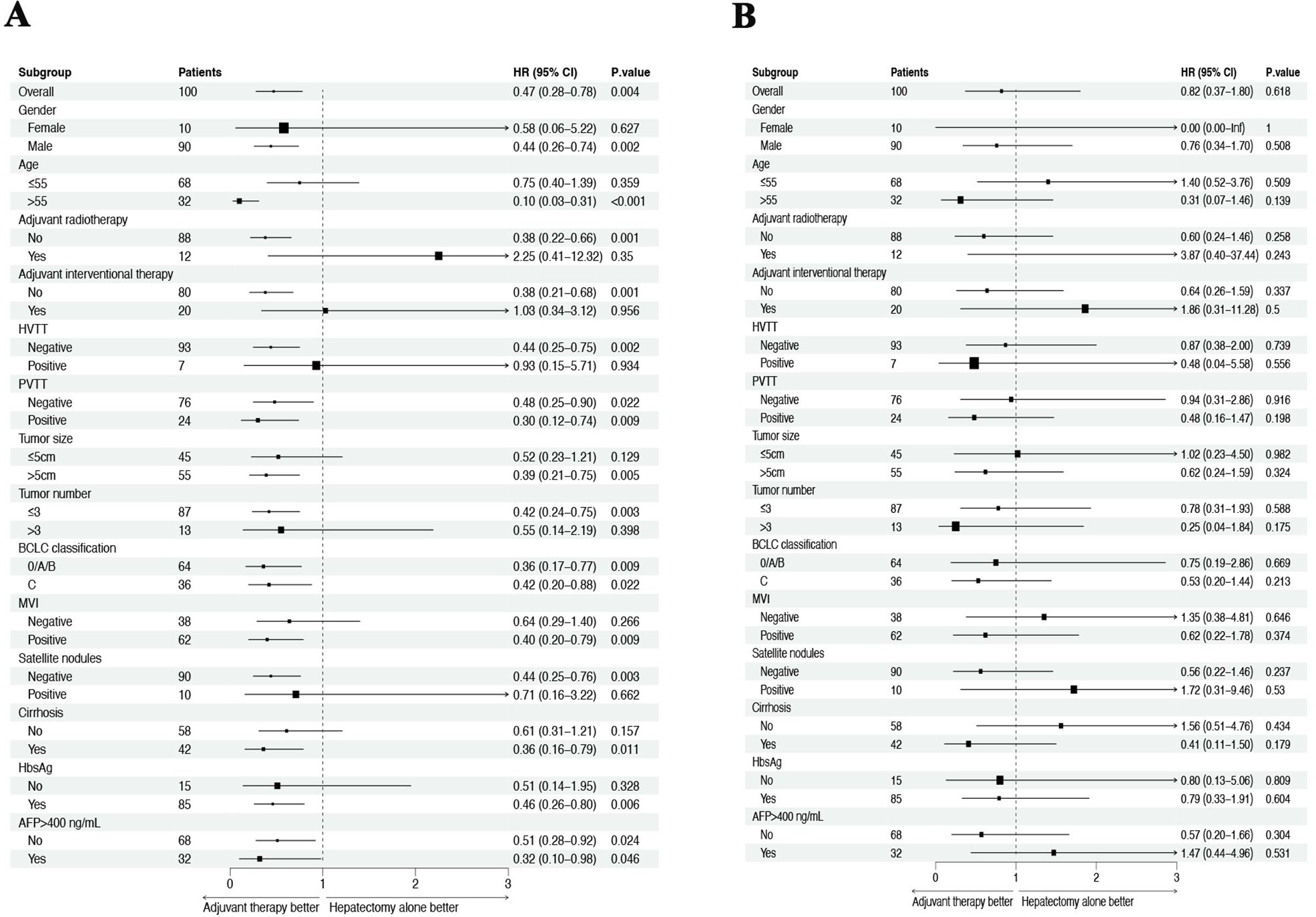 Subgroup analysis was performed to investigate the effect of adjuvant therapy on postoperative outcomes in HCC patients with high risk of recurrence. Results showed that adjuvant TKIs combined with anti-PD-1 antibody significantly improved RFS in male HCC patients (HR = 0.44, 95% CI = 0.26−0.74), those over 55 years old (HR = 0.10, 95% CI = 0.03−0.31), without adjuvant radiotherapy (HR = 0.38, 95% CI = 0.22−0.66), and without HVTT (HR = 0.44, 95% CI = 0.25−0. Other factors associated with longer RFS included: tumor size > 5cm (HR = 0.39, 95% CI = 0.21−0.75), tumor number ≤3 (HR = 0.42, 95% CI = 0.24−0.75), positive MVI (HR = 0.40, 95% CI = 0.20−0.79), negative satellite nodules (HR = 0.44, 95% CI = 0.25−0.76), presence of cirrhosis (HR = 0.36, 95% CI = 0.16−0.79), and positive HBsAg. (HR = 0.46, 95% CI = 0.26−0.80). The analysis also found that the AT group consistently achieved longer RFS, regardless of PVTT presence, BCLC stage less than C, or AFP greater than 400 ng/ml (Figure 3A). However, the AT group had similar OS compared to the HA group across all subgroups of HCC patients (Figure 3B).