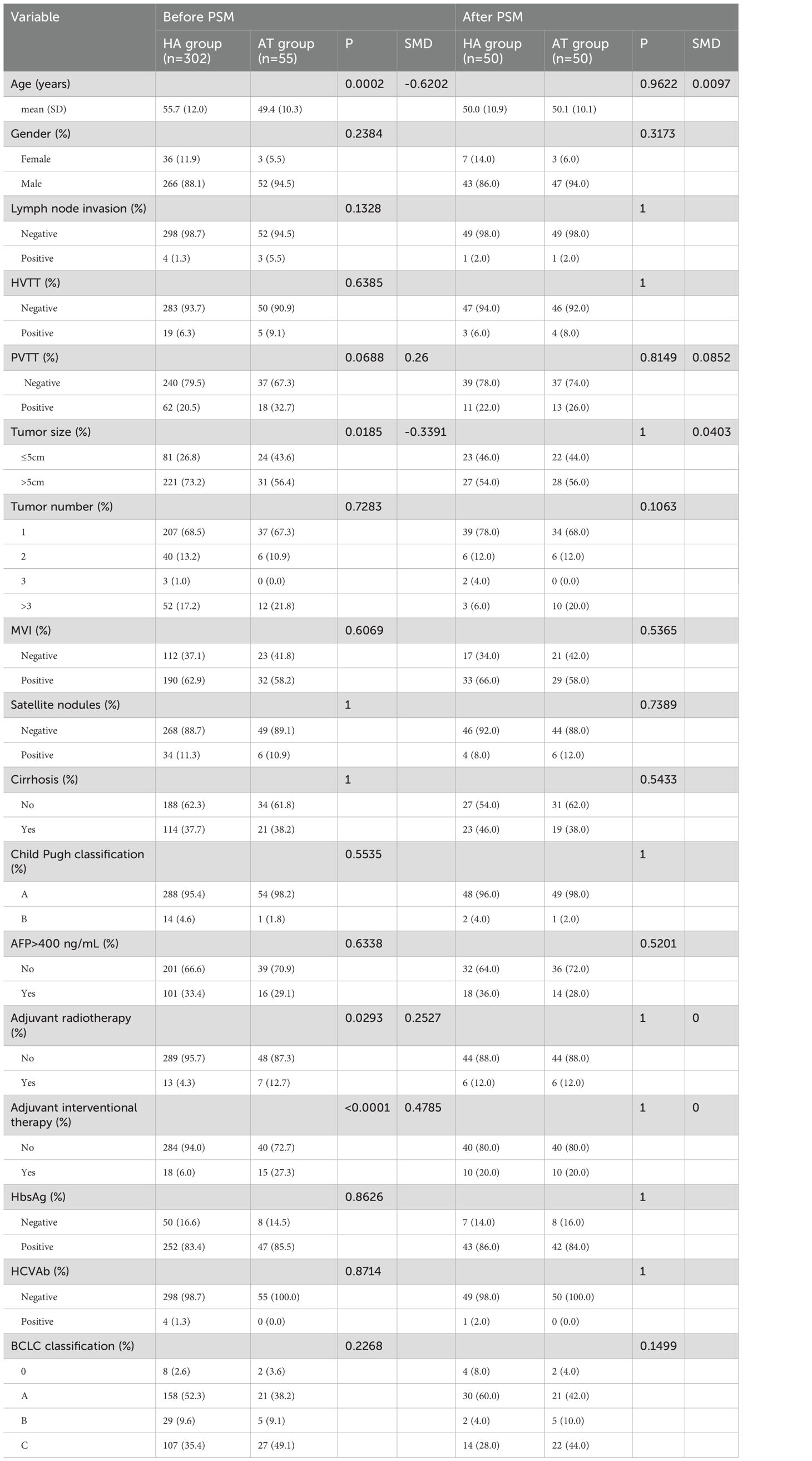 Statistical analysis was performed using R software version 4.3.2 (http://www.R-project.org). Continuous variables with a normal distribution were presented as mean ± standard deviation (SD), while those without were reported as medians and interquartile ranges (IQR). Independent samples t-tests or Mann-Whitney U tests were used to compare differences between continuous variables, depending on the specific circumstances. Categorical variables were presented as numbers (n) or percentages (%), and compared using chi-squared test or Fisher’s exact test. To adjust for confounding factors, a 1:1 propensity score matching (PSM) was performed. Propensity scores, ranging from 0 to 1, were generated using binary logistic regression with selected variables. Nearest-neighbor matching was used to match patients in the AT group to those in the HA group. Pairs were matched within a propensity-score logit range of 0.16 SD. A standardized mean difference (SMD) below 0.1 indicates a meaningful balance in baseline covariate (22, 23). Survival curves were estimated using the Kaplan-Meier method and compared with the Log rank test. Univariate and multivariate Cox regression analyses determined independent prognostic factors for RFS and OS. In the univariate Cox regression, only factors with a p-value less than 0.05 were included in the multivariate analysis. Subgroup survival analysis was conducted using univariate Cox regression, stratified by clinical variables, and forest plots were drawn with hazard ratio (HR) and 95% confidence interval (CI). The differences between groups with a two-tailed p < 0.05 were considered statistically significant.