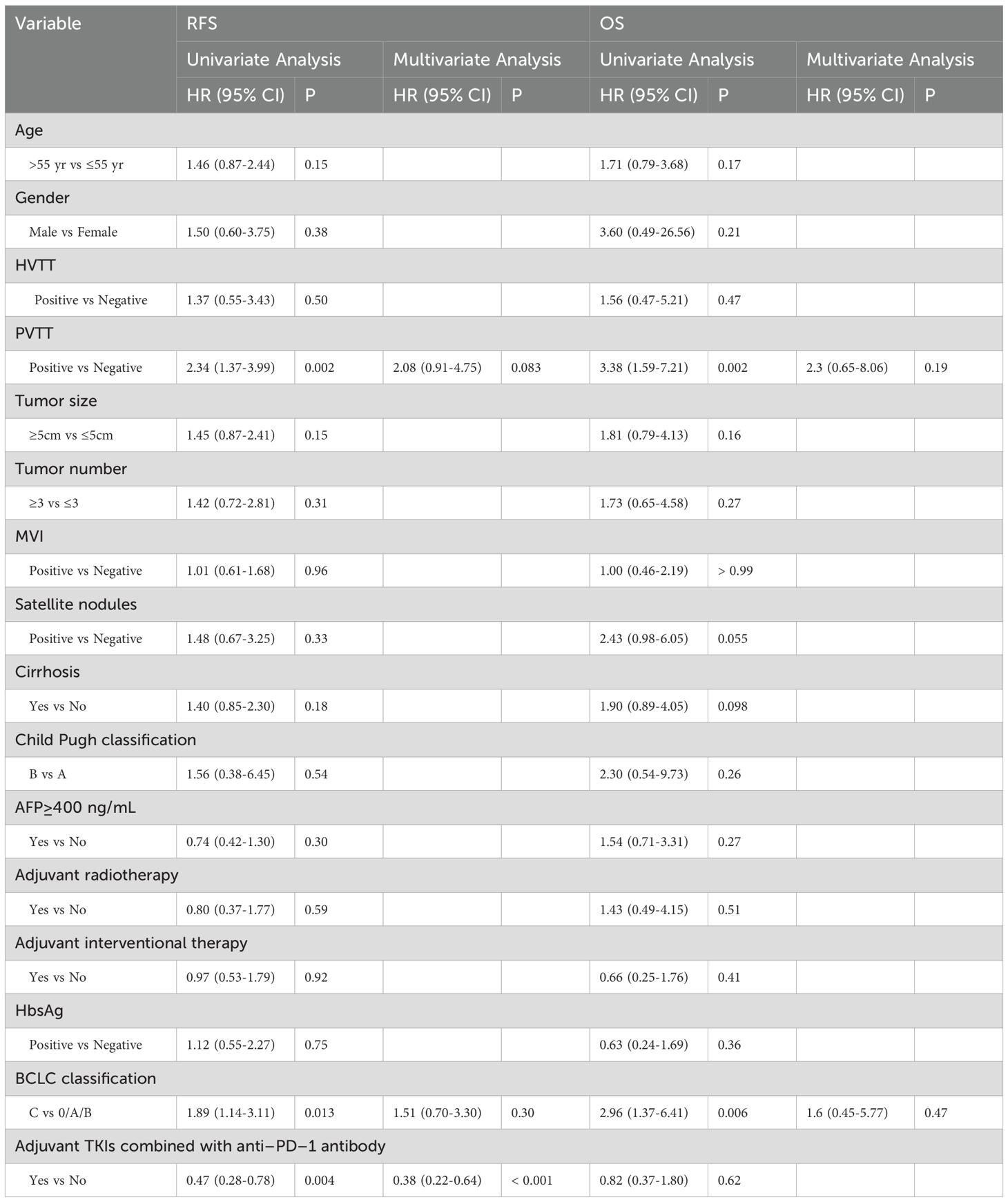 As shown in Table 2, univariable analysis identified adjuvant TKIs combined with anti−PD−1 therapy (HR = 0.47, 95% CI = 0.28-0.78; p = 0.004), PVTT (HR = 2.34, 95% CI = 1.37-3.99; p = 0.002), BCLC stage (HR = 1.89, 95% CI = 1.14-3.11; p = 0.013) as significant predictors of RFS. In multivariable analysis, only adjuvant therapy remained an independent protective factor for RFS (HR = 0.38, 95% CI = 0.22-0.64; p < 0.001). For OS, univariate analysis showed PVTT (HR = 3.38, 95% CI = 1.59-7.21; p = 0.002) and BCLC stage (HR = 2.96, 95% CI = 1.37-6.41; p = 0.006) were significantly associated with survival prognosis. However, no independent predictors were identified in the multivariable analysis.