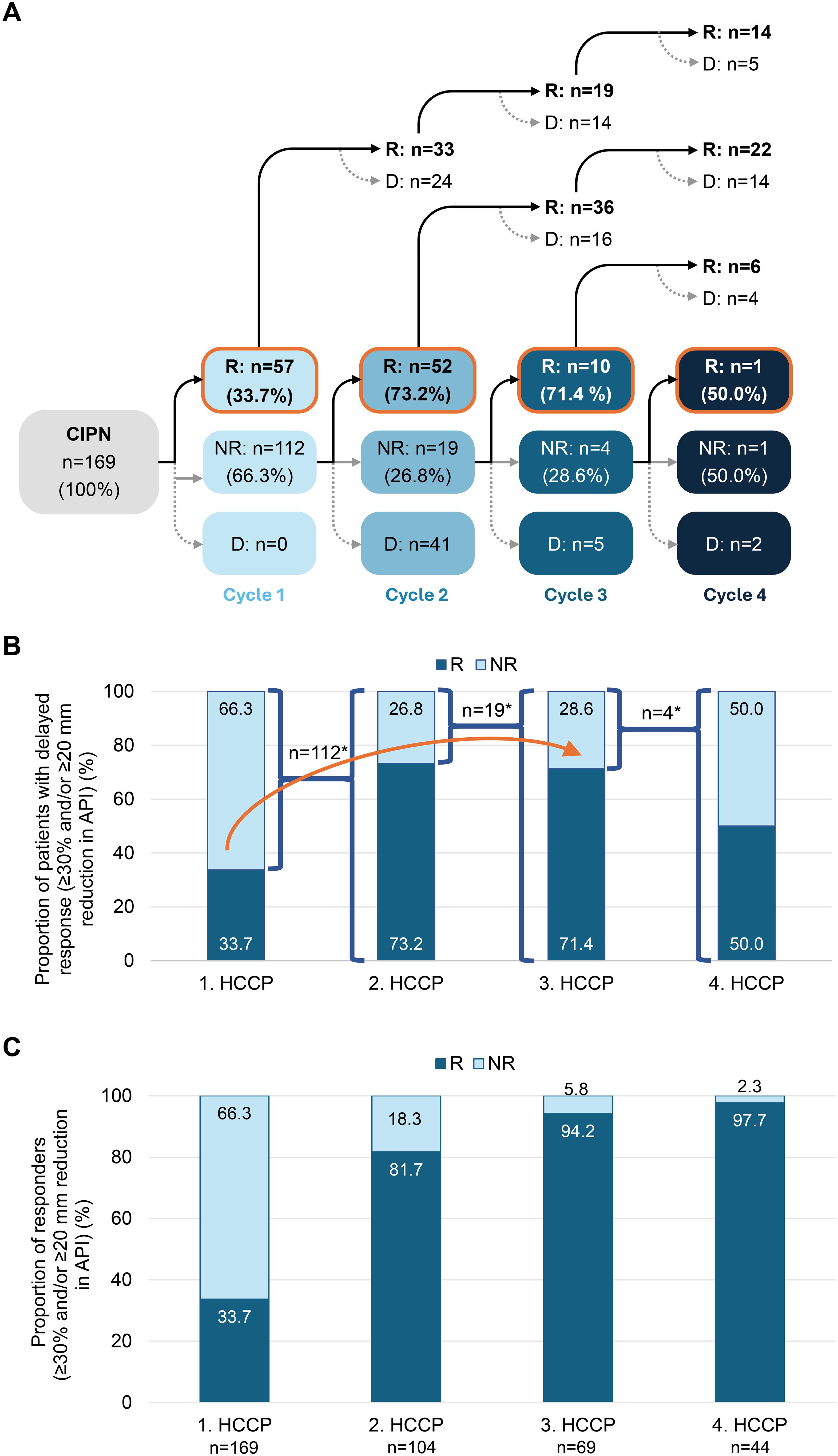 Figure 4. Conversion of initial non-responders to responders with successive HCCP treatments. (A) Patient flow following the first, second, third, and fourth HCCP treatments, with classification as responder (R) or non-responder (NR) based on a clinically meaningful reduction in average API, defined as a ≥20 mm and/or ≥30% improvement on the VAS. (B) Proportion of responders after the first HCCP treatment and among initial non-responders who received subsequent treatments. The arrow indicates the progressive conversion of initial non-responders to responders with successive HCCP treatments. In A and B, percentages refer to the number of non-responders treated further at each respective time point. (C) Percentage of responders 3 months after the first to fourth HCCP treatment (includes all patients who received treatment at each time point). *: n without D. API, Average Pain Intensity in the preceding 24 hours; CIPN, chemotherapy-induced peripheral neuropathy; D, treatment discontinuation; HCCP, high-concentration capsaicin patch; NR, non-responders; R, responders; VAS, Visual Analogue Scale.