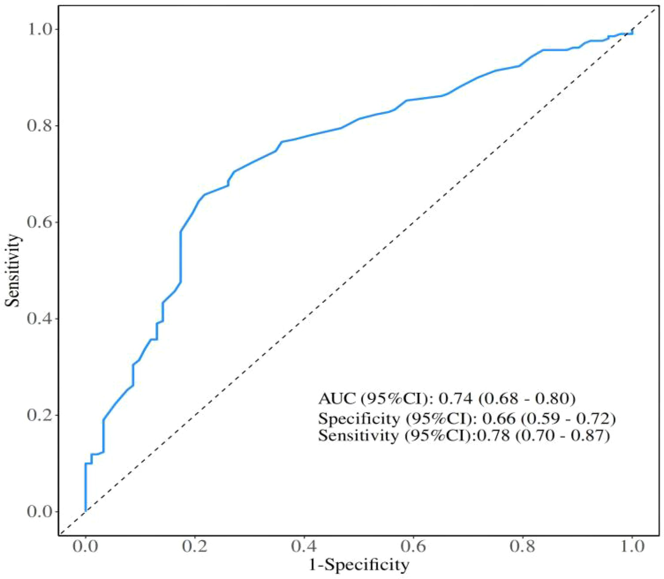 The optimal cutoff value of LHR was determined using receiver operating characteristic (ROC) curve analysis, with overall survival (OS) as the endpoint. The area under the curve (AUC) was 0.74 (95% CI: 0.68–0.80). By maximizing the product of sensitivity (78%) and specificity (66%), the optimal cutoff value of LHR was identified as 35.3.