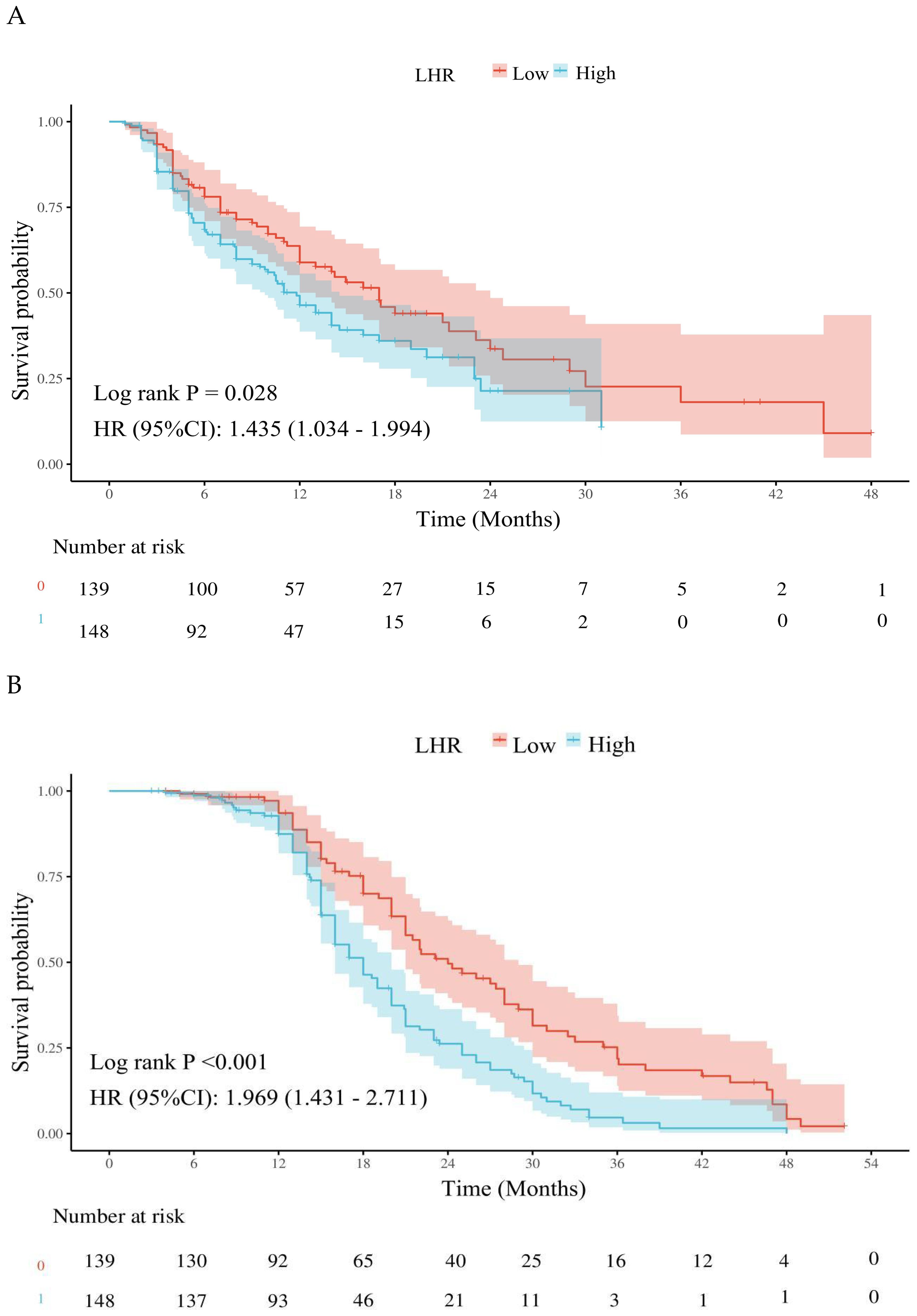 Kaplan–Meier survival analysis demonstrated that patients in the low LHR group had significantly better PFS and OS compared with those in the high LHR group. The median PFS was 17.00 months (95% CI: 14.00–22.00) in the low LHR group versus 11.80 months (95% CI: 9.80–14.50) in the high LHR group (p = 0.028) (Figure 2A). Similarly, the median OS was 24.00 months (95% CI: 21.00–29.00) in the low LHR group compared with 18.00 months (95% CI: 16.00–20.00) in the high LHR group (p < 0.001) (Figure 2B).