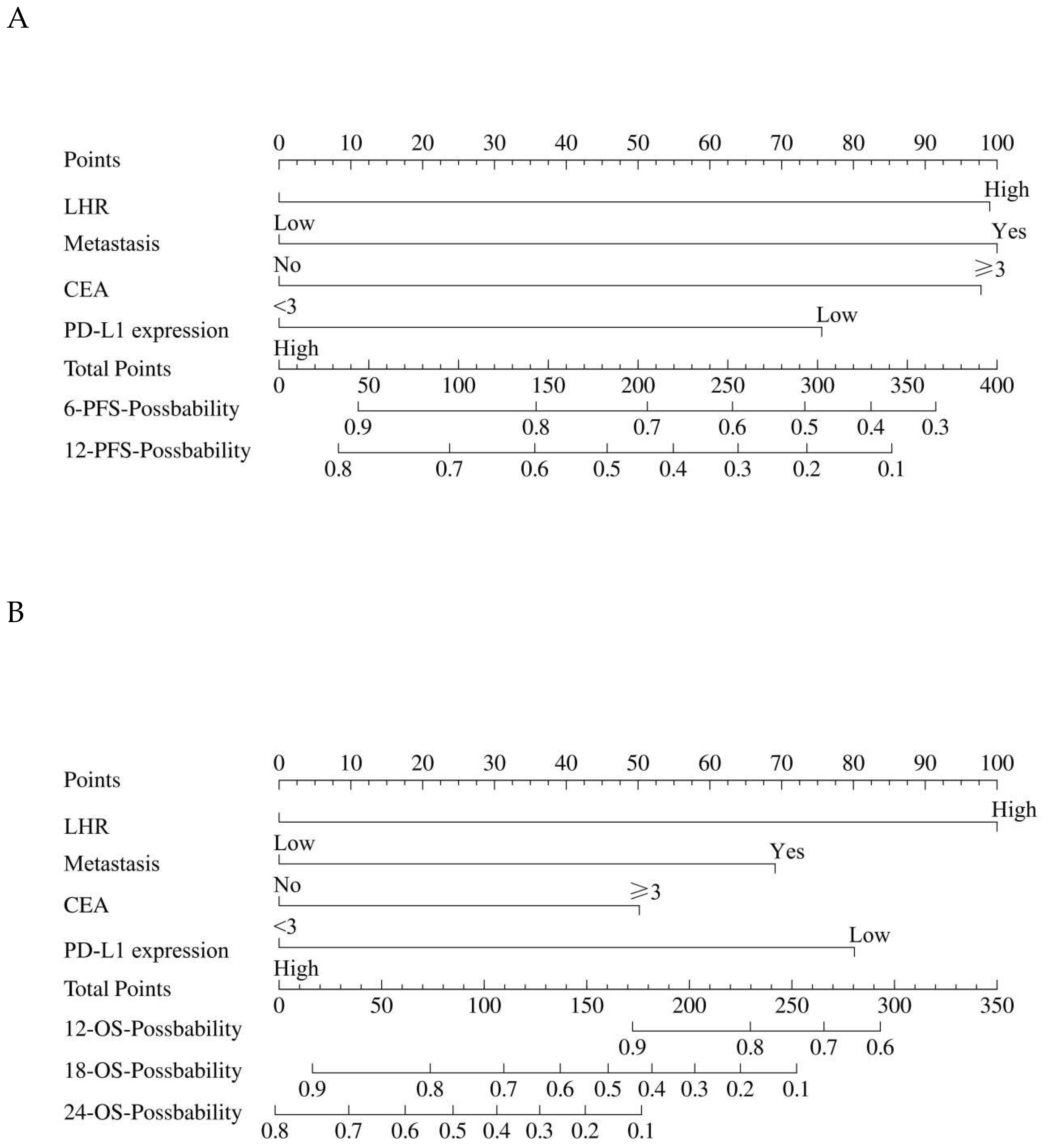 Specifically, the PFS nomogram was constructed from these four independent prognostic factors (LHR, distant metastasis, CEA level, and PD-L1 expression) to predict the 6- and 12-month progression-free survival probabilities (Figure 3A). Similarly, the OS nomogram was developed using the same set of variables to predict 12-, 18-, and 24-month overall survival probabilities (Figure 3B).