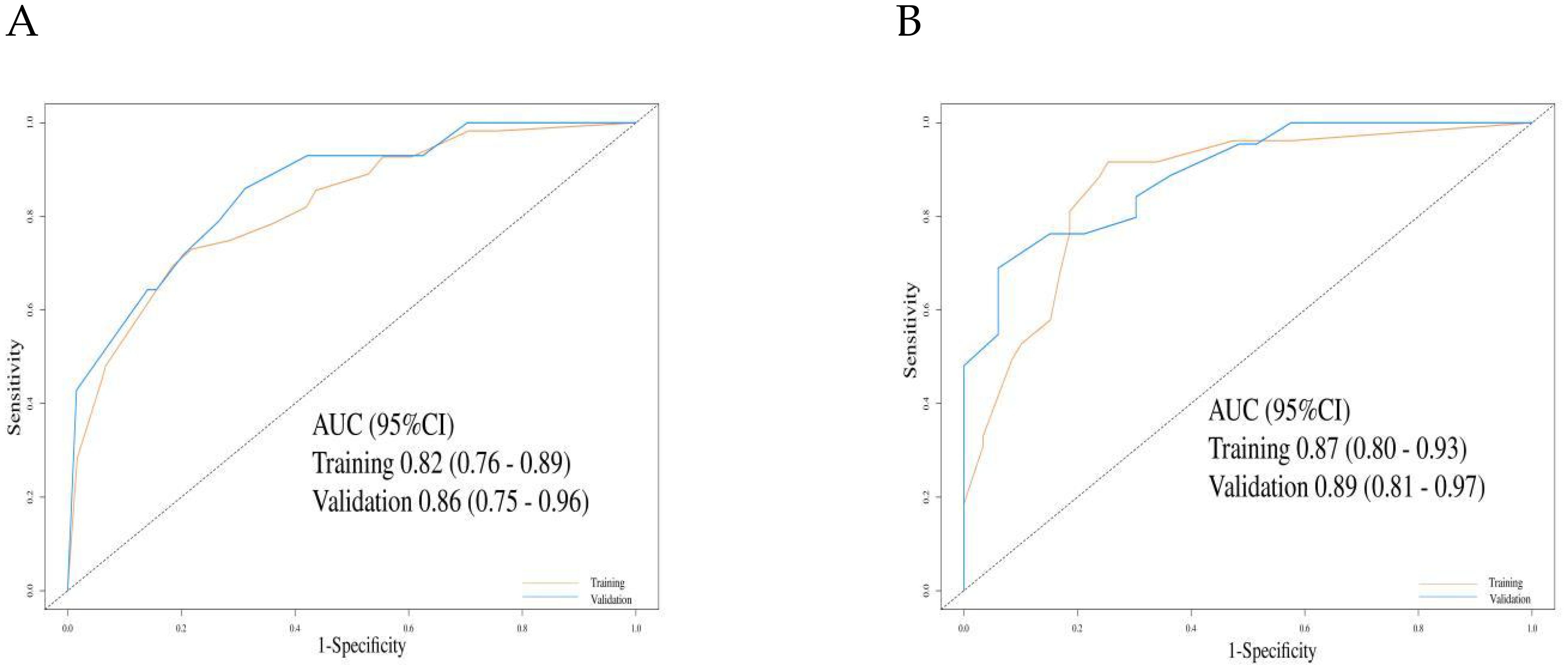 Figure 4. The evaluation of the nomogram for predicting Progression-free survival. (A) Graph showing the training set and validation set receiver operating characteristic (ROC) evaluation plots for 6-month prognostic prediction model; (B) Graph showing the training set and validation set ROC evaluation plots for 12-month prognostic prediction model. AUC, Area under the curve.