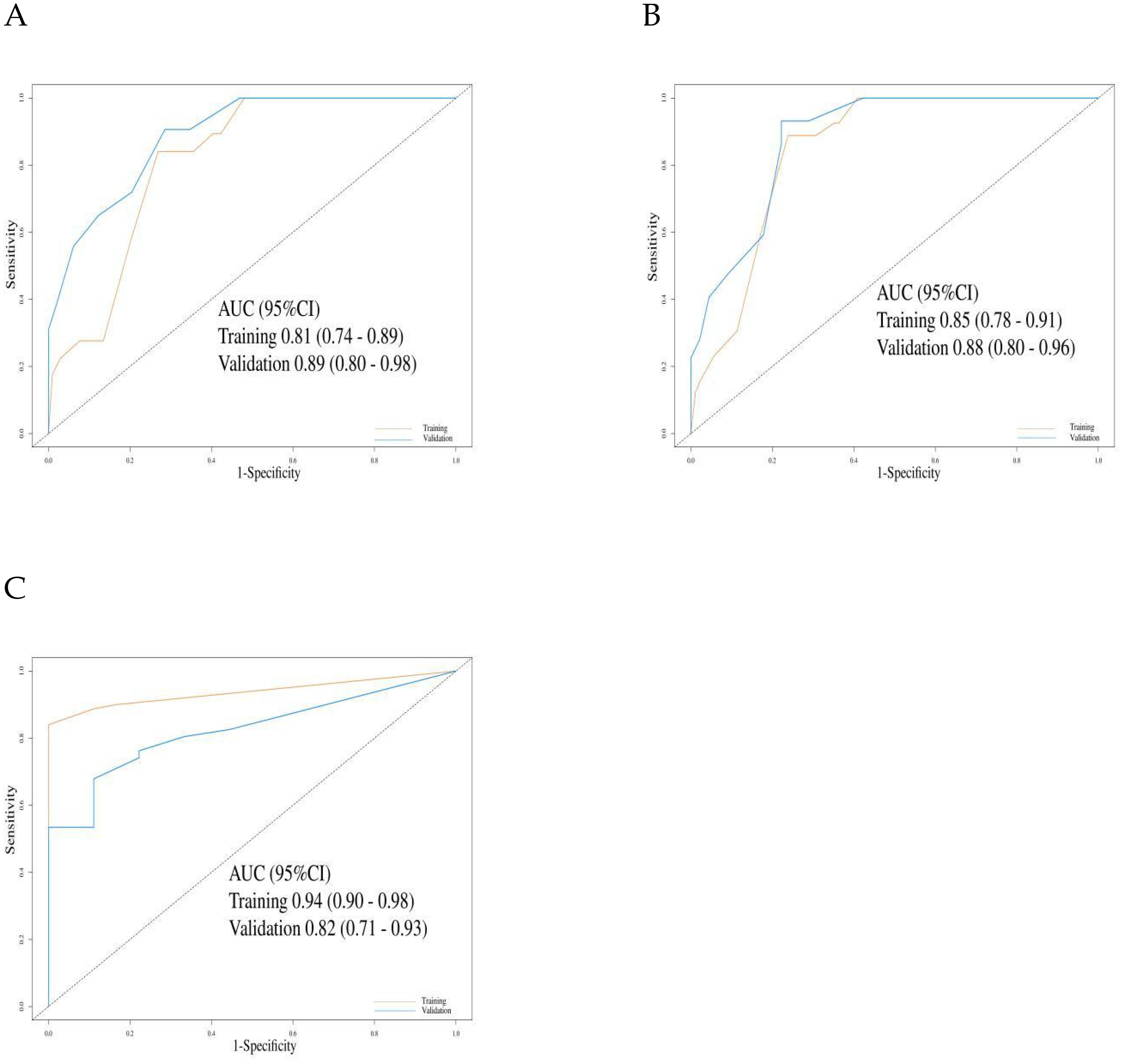 Figure 5. The evaluation of the nomogram for predicting Overall survival. (A) Graph showing the training set and validation set receiver operating characteristic (ROC) evaluation plots for 12-month prognostic prediction model; (B) Graph showing the training set and validation set ROC evaluation plots for 18-month prognostic prediction model.C: Graph showing the training set and validation set ROC evaluation plots for 24-month prognostic prediction model. AUC, Area under the curve.