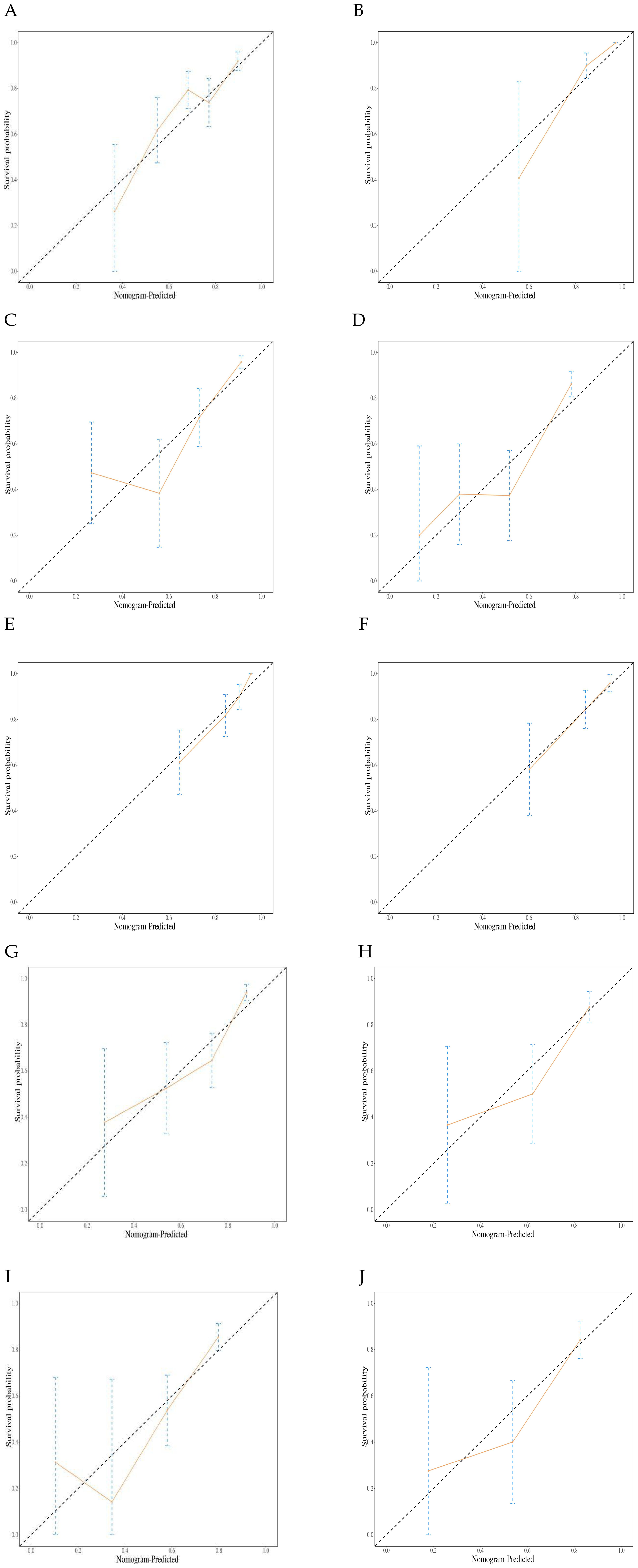 Calibration curve analysis showed that the predicted survival probabilities were highly consistent with the observed outcomes, indicating that the nomogram model has good predictive accuracy and clinical applicability (Figures 6A–J).