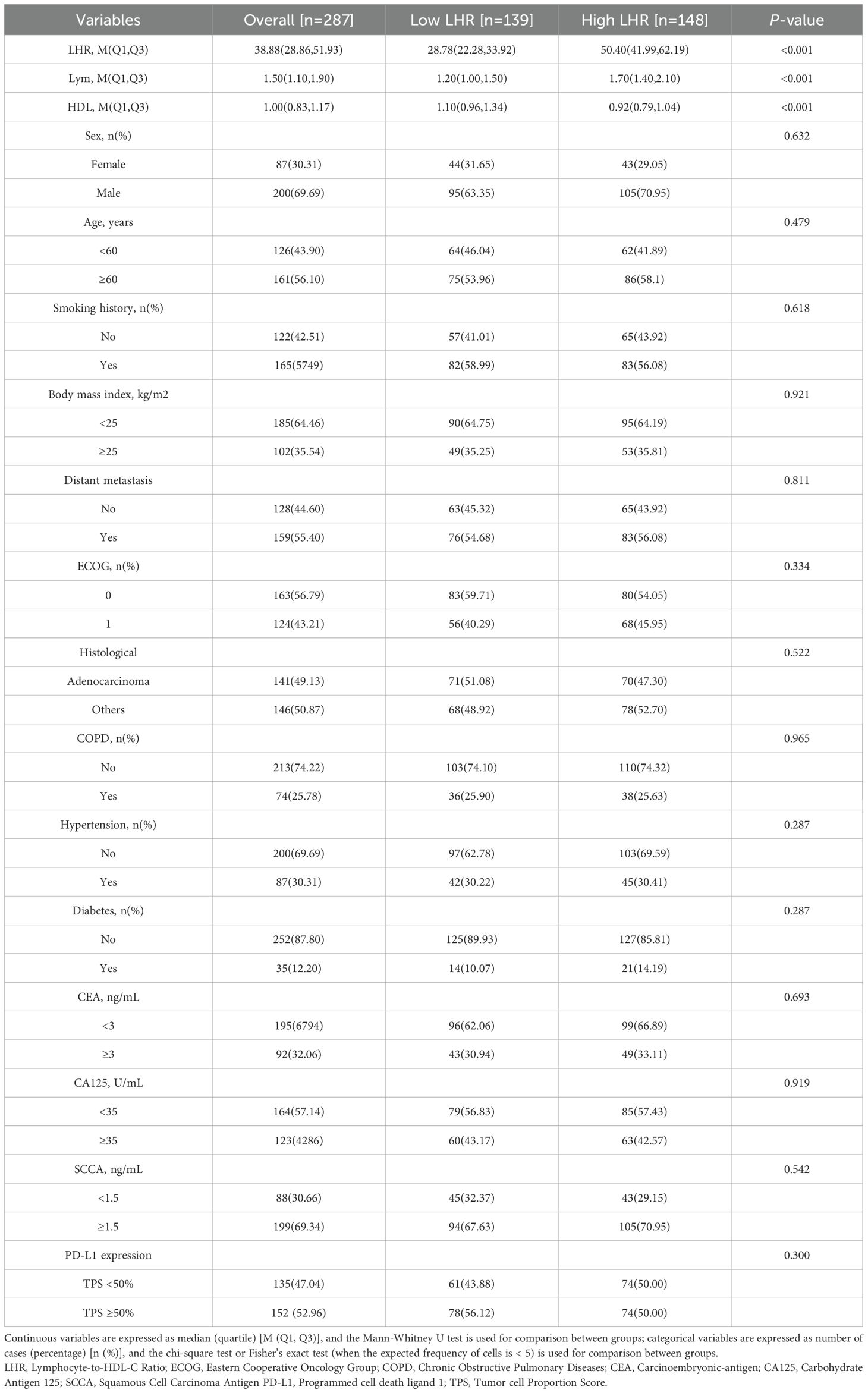 Among the 287 patients with advanced NSCLC who received first-line chemo-immunotherapy, no complete responses (CR) were observed. In the low LHR group, 68 patients (48.92%) achieved partial response (PR), compared with 53 patients (35.81%) in the high LHR group. Stable disease (SD) was observed in 55 patients (39.57%) in the low LHR group and 63 patients (42.57%) in the high LHR group. In addition, progressive disease (PD) occurred in 16 patients (11.51%) in the low LHR group and 32 patients (21.62%) in the high LHR group.