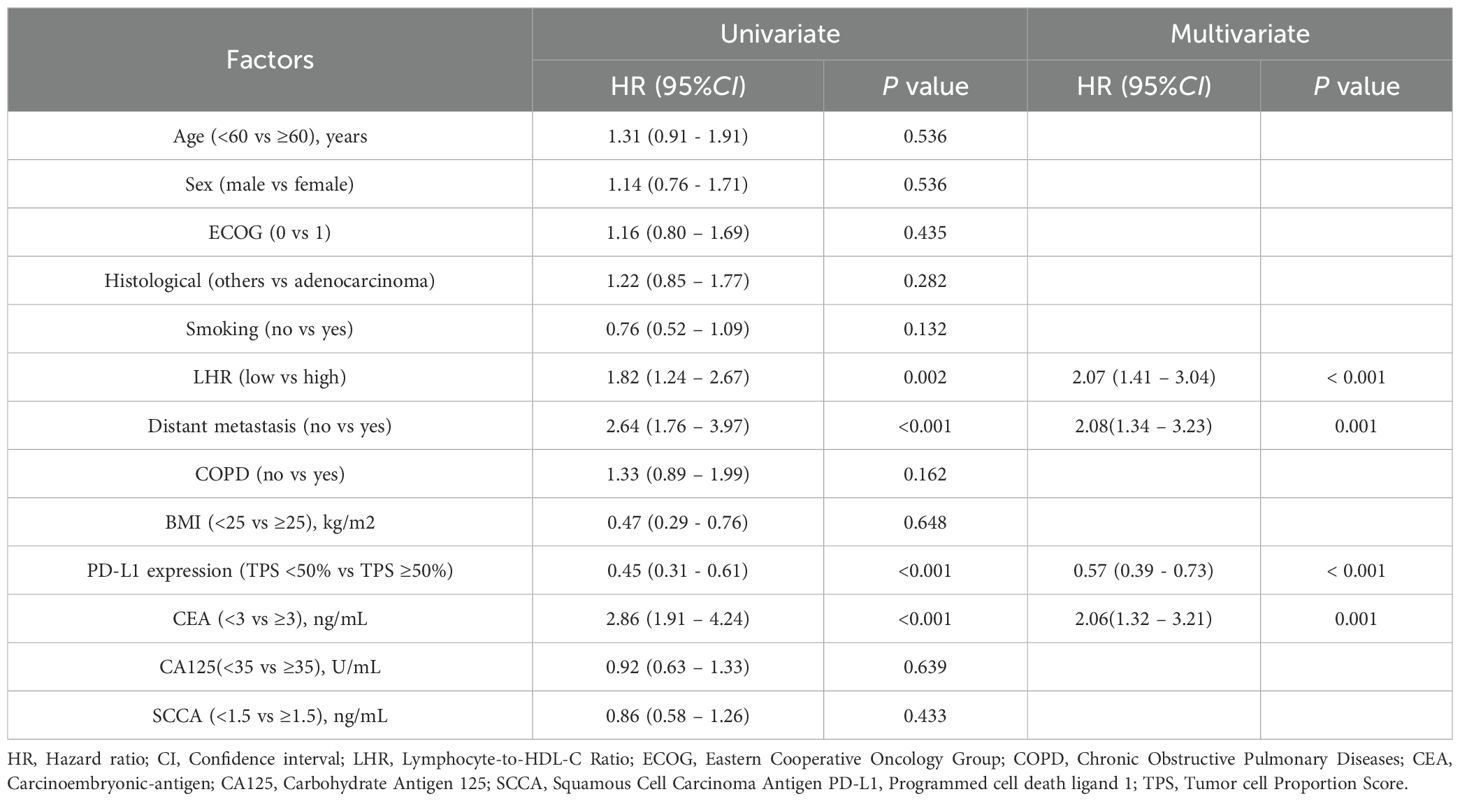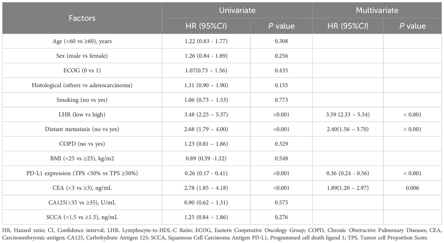 Multivariate analysis identified high LHR (HR = 2.07, 95% CI: 1.41–3.04, p < 0.001), presence of distant metastasis (HR = 2.08, 95% CI: 1.34–3.23, p = 0.001), and elevated CEA level (HR = 2.06, 95% CI: 1.32–3.21, p = 0.001) as independent adverse prognostic factors for PFS. In contrast, high PD-L1 expression was significantly associated with longer PFS (HR = 0.57, 95% CI: 0.39–0.86, p = 0.006).