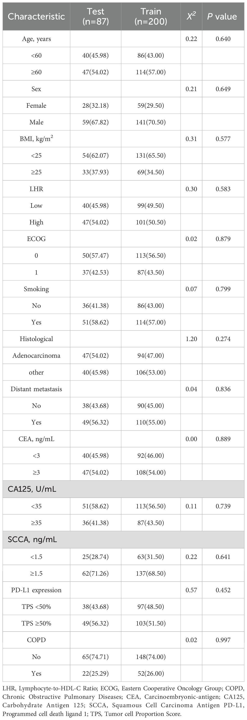 Baseline clinical and tumor characteristics of the study population are summarized in Table 1, including sex, age, history of hypertension and diabetes, pathological subtype, PD-L1 expression status, and presence of distant metastasis. Hematological parameters included lymphocyte count, HDL-C level, LHR, carcinoembryonic antigen (CEA), and squamous cell carcinoma antigen (SCCA). Significant differences were observed between the two groups in lymphocyte count, HDL-C level, and LHR (all p < 0.001), while no significant differences were noted for other clinical or tumor-related characteristics.