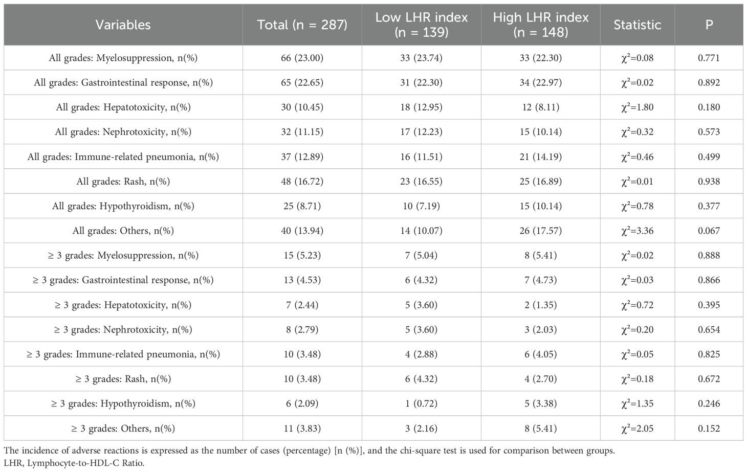 In this study cohort, the majority of patients tolerated chemo-immunotherapy well, with no cases of treatment discontinuation due to adverse events (Table 6). The most common adverse events included myelosuppression (23.0%), gastrointestinal reactions (22.7%), rash (16.7%), immune-related pneumonia (12.9%), hepatotoxicity (10.5%), renal and gastrointestinal reactions (4.5%), immune-related pneumonia (3.5%), rash (3.5%), nephrotoxicity (2.8%), hepatotoxicity (2.4%), and hypothyroidism (2.1%). Overall, adverse events were manageable and did not lead to treatment discontinuation. No significant differences were observed between the two groups in the incidence of adverse events (p > 0.05).