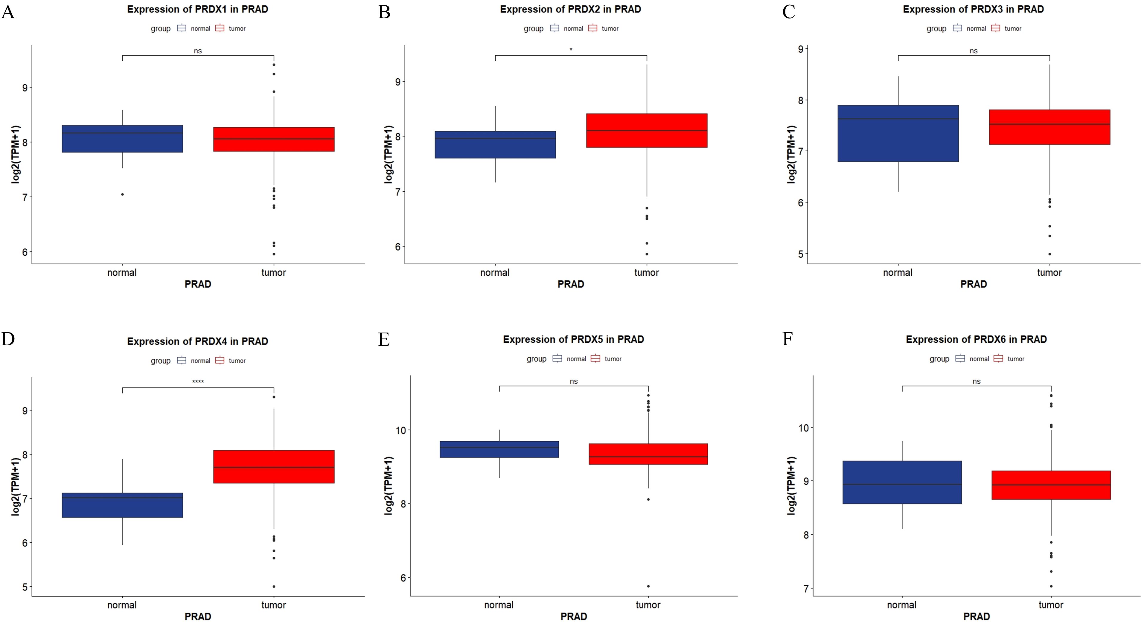 Six box plots showing the expression levels of different PRDX genes in prostate cancer (PRAD) samples. Panels A to F display PRDX1 to PRDX6. Each plot compares gene expression between normal and tumor groups, with varying statistical significance indicators marked above the plots. Normal samples are shown in blue, tumor samples in red.