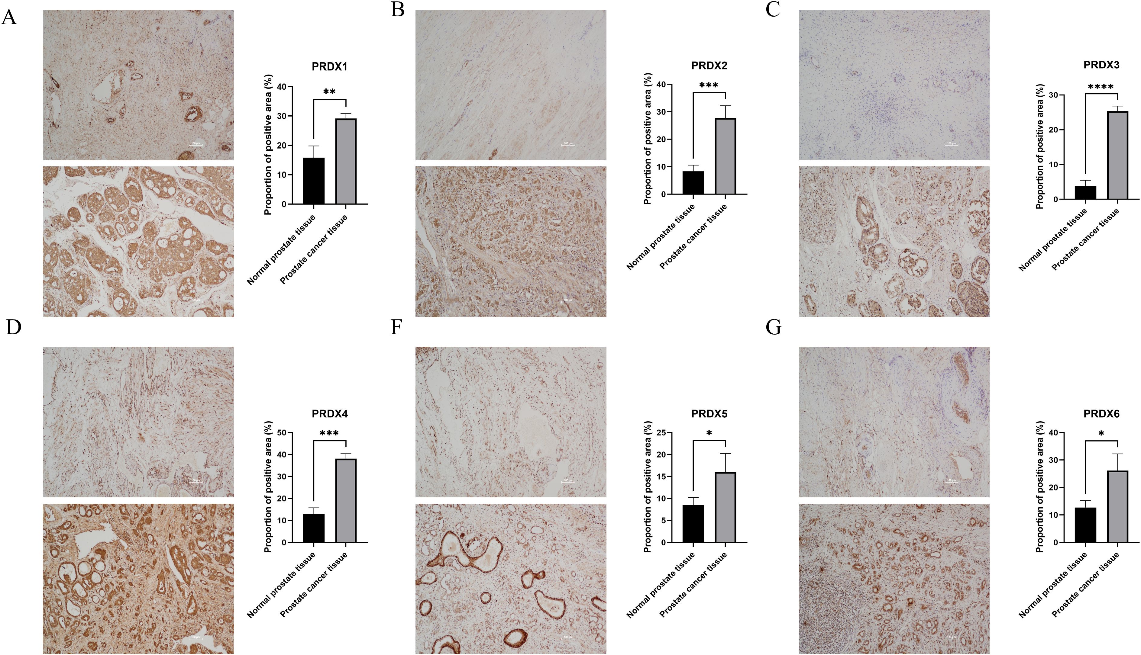 Figure 4. Positive proportion of PRDXs family in normal prostate and PCa tissues. (A) Positive proportion of PRDX1 in normal prostate and PCa tissues. (B) Positive proportion of PRDX2 in normal prostate and PCa tissues. (C) Positive proportion of PRDX3 in normal prostate and PCa tissues. (D) Positive proportion of PRDX4 in normal prostate and PCa tissues. (E) Positive proportion of PRDX5 in normal prostate and PCa tissues. (F) Positive proportion of PRDX6 in normal prostate and PCa tissues. *P<0.05, **P<0.01. ***P<0.001,****P<0.0001. All experimental biological and technical replicates were conducted at least three times.