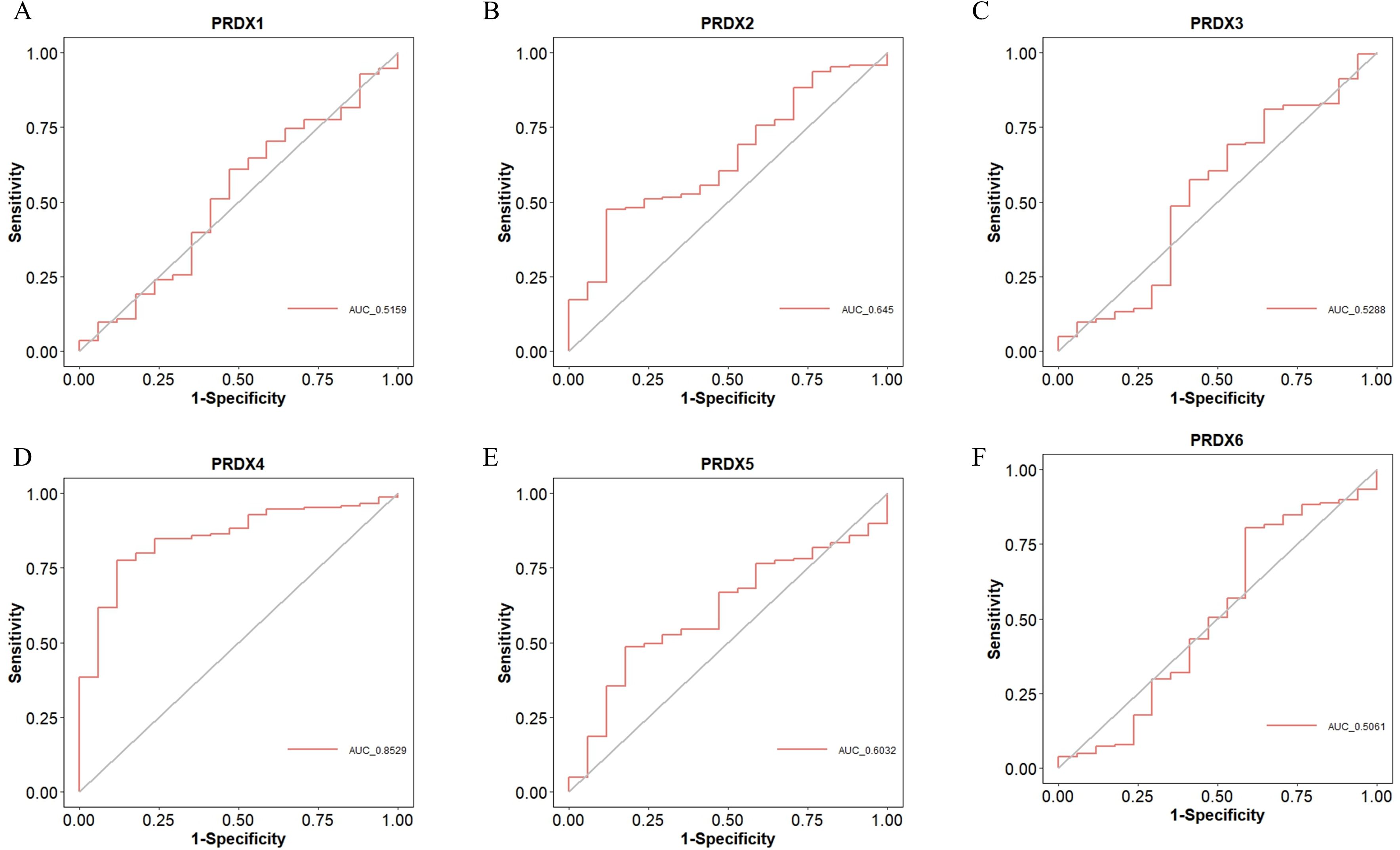 Six ROC curve graphs labeled A to F, each for PRDX1 to PRDX6, showing sensitivity versus 1-specificity. AUC values are PRDX1: 0.5159, PRDX2: 0.645, PRDX3: 0.5288, PRDX4: 0.8529, PRDX5: 0.6032, and PRDX6: 0.5061. Curves are red with a diagonal reference line.