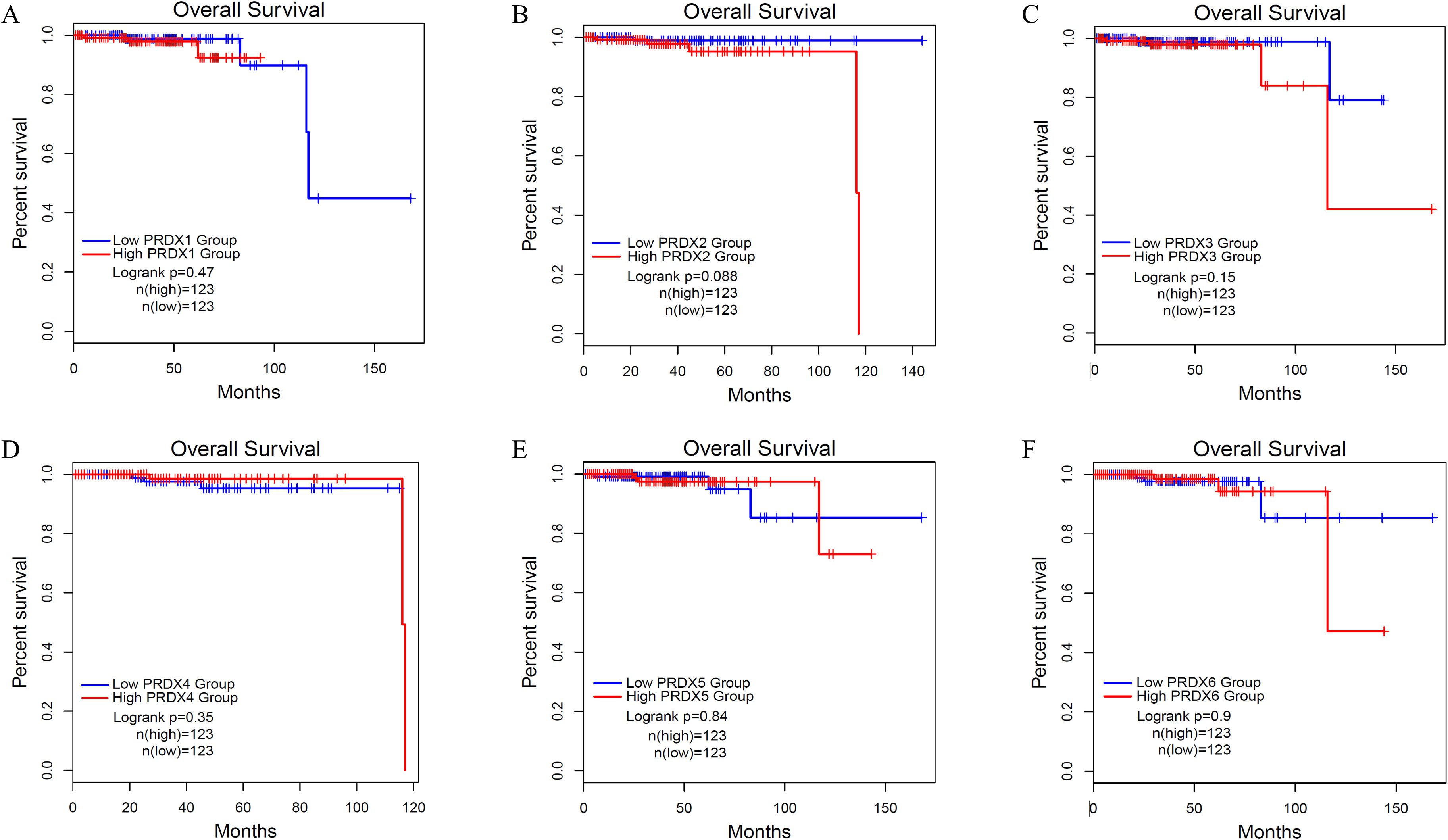 Six Kaplan-Meier survival curves (A to F) compare high and low expression groups for PRDX1 through PRDX6 over time. Each graph shows percent survival on the y-axis and months on the x-axis, with corresponding logrank p-values and group sizes for both high and low expressions, each having 123 subjects. Most curves show similar trends with slight variations in survival differences between groups.