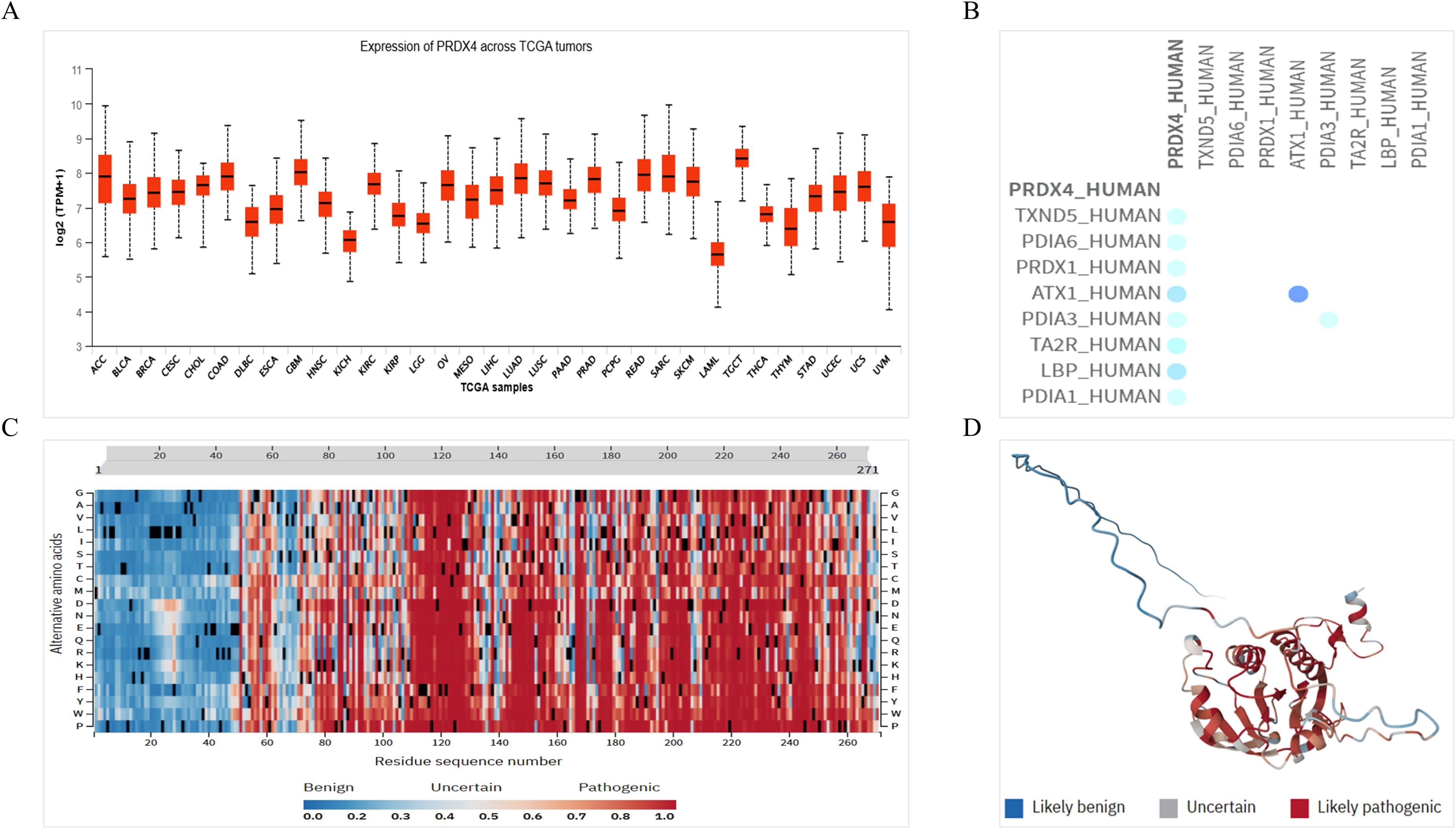 Panel A shows a box plot of PRDX4 expression across various TCGA tumor samples. Panel B presents a protein interaction network with PRDX4 and related proteins like PRDX1 and TXND5. Panel C includes a heatmap of alternative amino acids across a residue sequence, color-coded by pathogenicity likelihood, ranging from benign to pathogenic. Panel D displays a protein structure model with regions color-coded to indicate benign, uncertain, or pathogenic effects.
