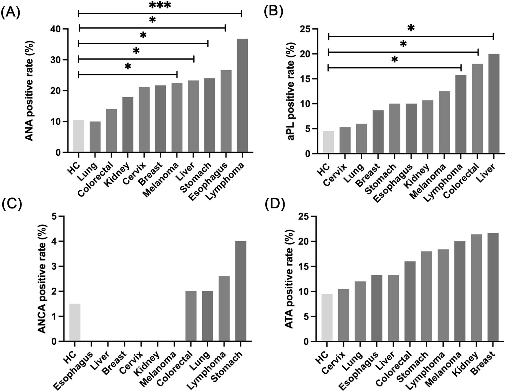 Figure 1. Prevalence of autoantibodies among treatment-naïve cancer patients. (A) Comparison of ANA positivity rates between patients with different cancer types and healthy controls. Significant higher positivity rates were observed in patients with melanoma, hepatocellular carcinoma, gastric cancer, esophageal cancer, and lymphoma compared to healthy controls. (B) Comparison of aPL positivity rates between patients with different cancer types and healthy controls. Patients with lymphoma, colorectal cancer, and hepatocellular carcinoma exhibited significantly higher positivity rates compared to healthy controls. (C) Comparison of ANCA positivity rates between patients with different cancer types and healthy controls. Patients with colorectal cancer, lung cancer, lymphoma, and gastric cancer demonstrated significantly higher positivity rates compared to healthy controls. ANCA positivity was not detected in patients with esophageal cancer, hepatocellular carcinoma, breast cancer, cervical cancer, renal cell carcinoma, or melanoma. (D) Comparison of ATA positivity rates between patients with different cancer types and healthy controls. All cancer types exhibited significantly higher ATA positivity rates compared to healthy controls. *P < 0.05; ***P < 0.001.