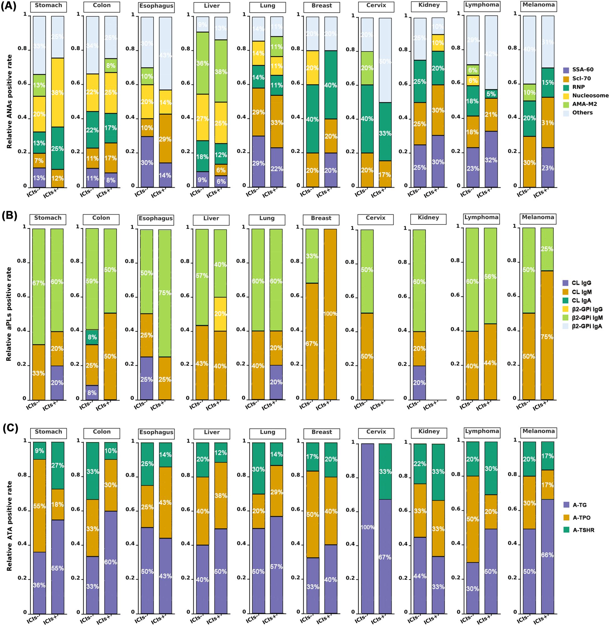 Results: Cancer patients demonstrated significantly elevated AAb prevalence compared to healthy controls. The ICI− group showed positivity rates of 20.1% for ANA, 11.5% for aPL, 1.7% for ANCA, and 17.3% for ATA, compared to 10.5%, 4.5%, 1.5%, and 9.5% in healthy controls, respectively. After ICI therapy, ANA positivity increased to 33.6%. CTLA-4 inhibitor recipients demonstrated higher ANA frequencies than PD-1/PD-L1 monotherapy recipients (57.1% vs 27.1%),. Tumor stage did not significantly influence AAb prevalence. Colorectal, hepatocellular, and renal cancers showed significant ANA increases after ICI treatment. Anti-Scl-70, anti-SSA-60, and anti-RNP were the most frequently elevated ANA subtypes. Anti-thyroglobulin was the most responsive ATA subtype following ICI therapy.