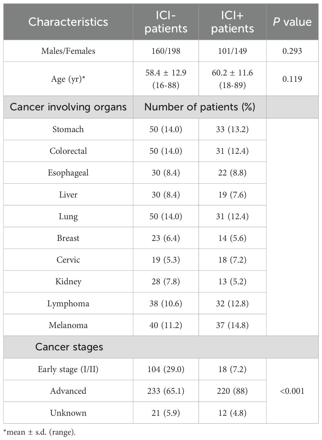 We enrolled 358 treatment-naïve cancer patients (ICI- patients) and 250 cancer patients who had received at least 6 months of ICI therapy (ICI+ patients). Additionally, we collected serum samples from 200 healthy individuals undergoing routine physical examinations during the same period as controls. The two cancer patient groups showed no significant differences in gender distribution or age (P>0.05). The cancer types and their respective frequencies in both patient groups are presented in Table 1.