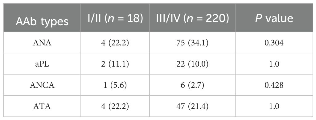 We investigated the AAb profiles in patients with tumors at different stages receiving ICIs. As shown in Table 2, although no statistical significance was observed, patients with advanced-stage tumors (stages III/IV) exhibited increased ANA positivity rates (34.1%) and slightly decreased ANCA positivity rates (2.7%) compared to those with early-stage tumors (stages I/II), while aPL and ATA showed no notable changes. These findings suggest that tumor stage may not critically influence AAb formation.