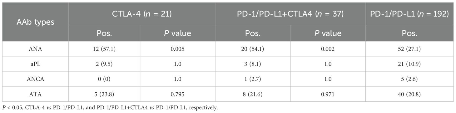 We examined AAb profiles according to ICI types (Table 3). ANA positivity was significantly higher in patients receiving CTLA-4 monotherapy (57.1%) or combination therapy (51.4%) compared to PD-1/PD-L1 monotherapy (27.6%; P = 0.005 and P = 0.002, respectively). No significant differences were observed in aPL, ANCA, or ATA positivity across treatment groups.