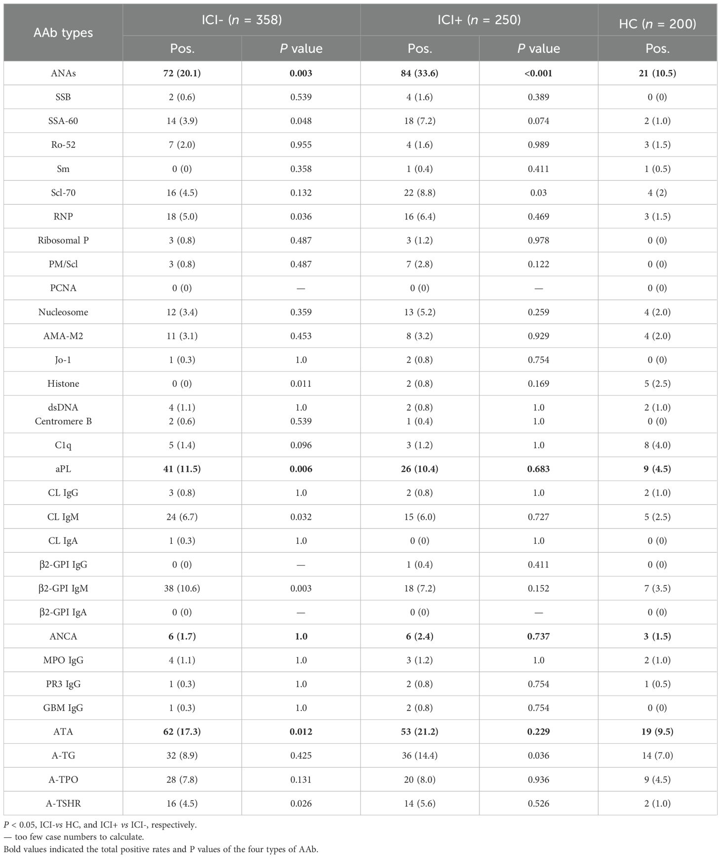 Methods: This study analyzed serum autoantibodies in 808 participants: 358 treatment-naïve cancer patients (ICI- group), 250 cancer patients following ≥6 months of ICI therapy (ICI+ group), and 200 healthy controls (HC). The cancer cohort comprised 10 solid tumor types. Serum samples were analyzed for antinuclear antibodies (ANA), antiphospholipid antibodies (aPL), anti-neutrophil cytoplasmic antibodies (ANCA), and anti-thyroid antibodies (ATA) using automated quantitative immunoassays.