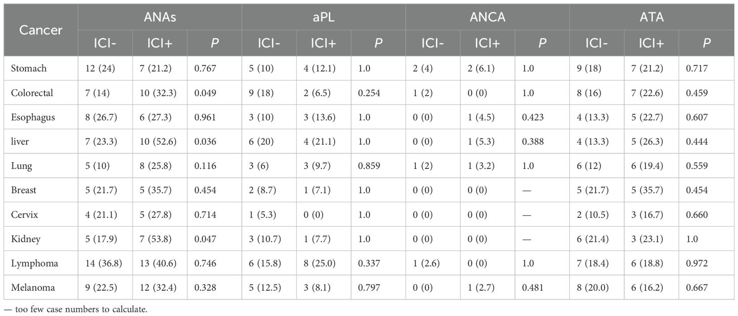 Comparison between ICI- and ICI+ groups revealed significant ANA increases in colorectal cancer (32.3%, P = 0.049), hepatocellular carcinoma (52.6%, P = 0.036), and renal cell carcinoma (53.8%, P = 0.047) compared with the ICI- group (Table 5). All tumor types except gastric cancer showed increased ANA positivity following immunotherapy. aPL and ANCA profiles remained largely unchanged, while ATA positivity increased in 9 of 10 tumor types (excluding melanoma), though without statistical significance.