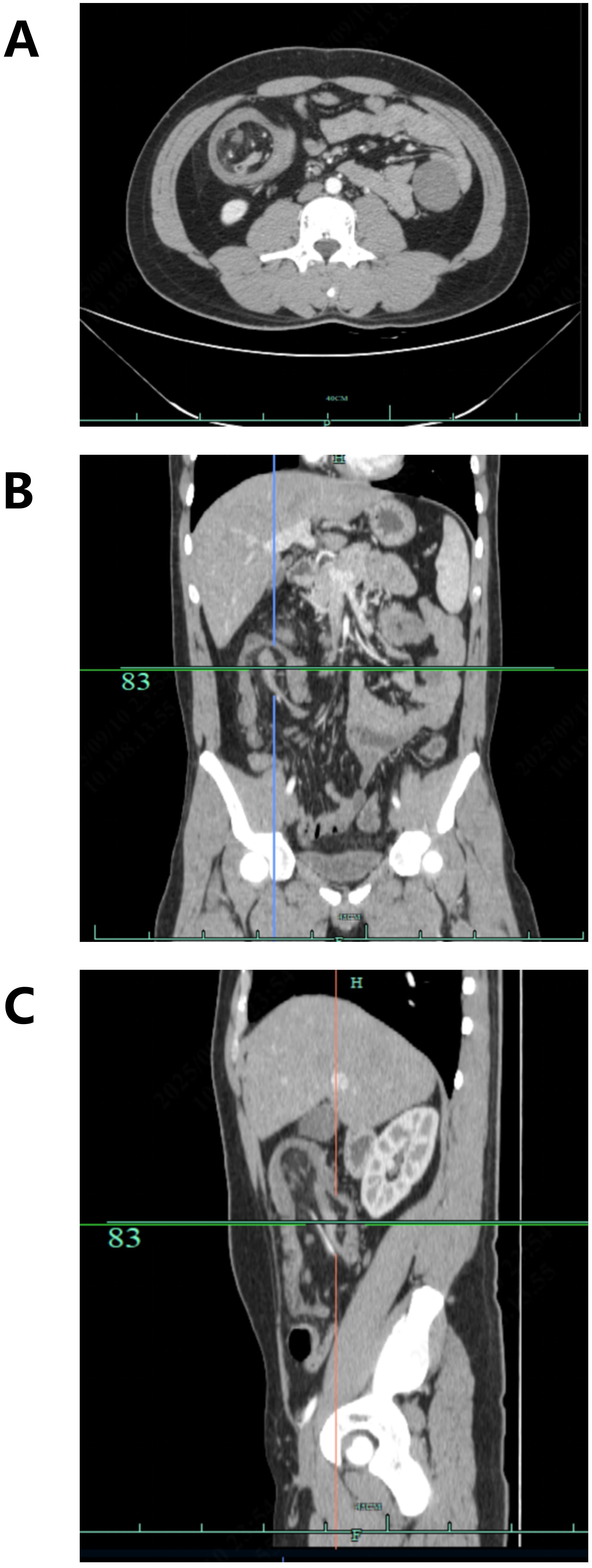 A 21-year-old male patient presented to our institution with a 3-day history of progressively worsening right upper and central abdominal pain. The patient denied identifiable triggers or associated gastrointestinal symptoms, including abdominal distension, vomiting, diarrhea, or constipation. No prior abdominal surgical history was reported.