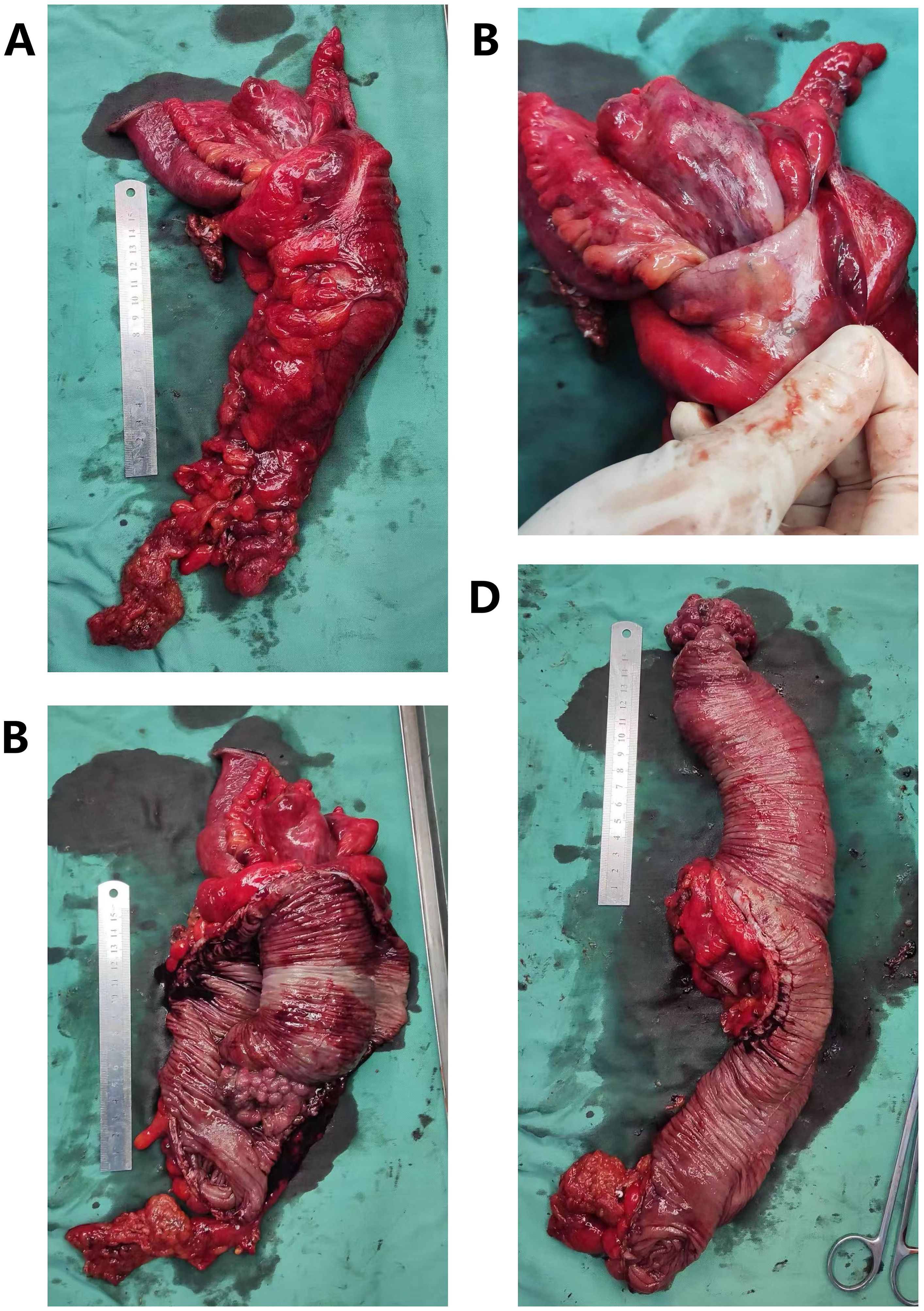 Figure 3. Gross pathological findings following right hemicolectomy. (A) Resected right hemicolectomy specimen showing intussusception of the ileocecal region into the colon. A 4-cm × 5-cm mass is palpable in the transverse colon. (B) The ileocecal region is intussuscepted into the colon and cannot be reduced by manual traction. (C) After opening the colon, the tumor is located in the ileocecal region (more specifically, at the initial segment of the colon, adjacent to the ileocecal valve), measuring 5.5 cm × 4.5 cm × 4 cm. The gross morphology is protrusive. (D) After full dissection of the colon and the intussuscepted small intestine, the measurements are as follows: colon length, 22 cm; diameter, 9 cm; ileum length, 25 cm; diameter, 10 cm.