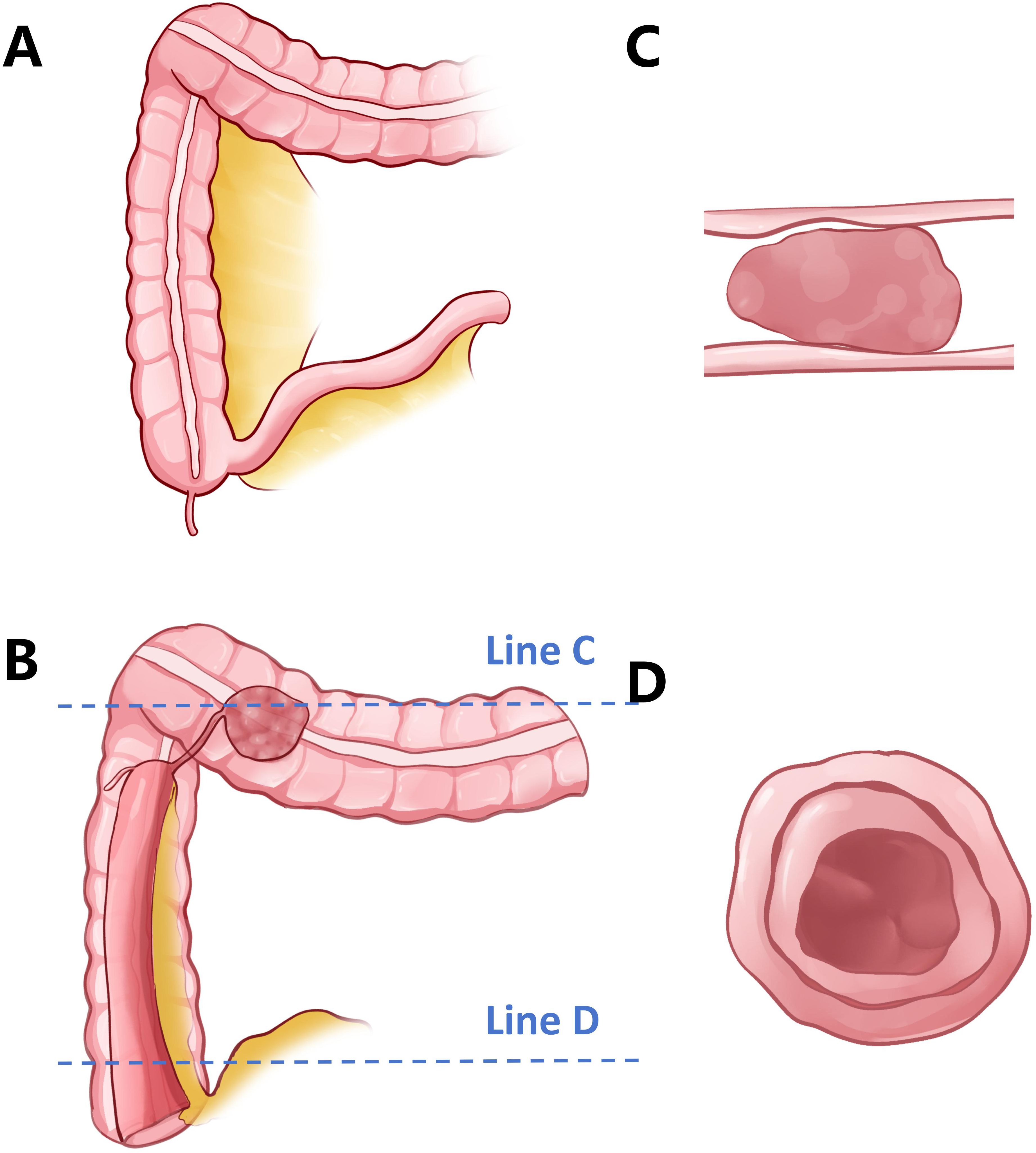 Figure 4. Schematic illustration of the intussusception in this case. (A) Normal anatomy of the ileocecal region and the right colon. (B) In this patient, a 4-cm × 5-cm mass is present in the ileocecal region. The entire ileocecal segment has intussuscepted into the ascending colon, resulting in the mass being positioned within the lumen of the transverse colon at the time of presentation. (C) Cross-sectional view along line C in (B). The tumor appears to originate from the transverse colon, mimicking a primary lesion. (D) Cross-sectional view along line D in (B). The ileocecal region exhibits a “target sign,” a “bulls-eye sign,” or sausage-shaped lesions, consistent with classic imaging features of intussusception.